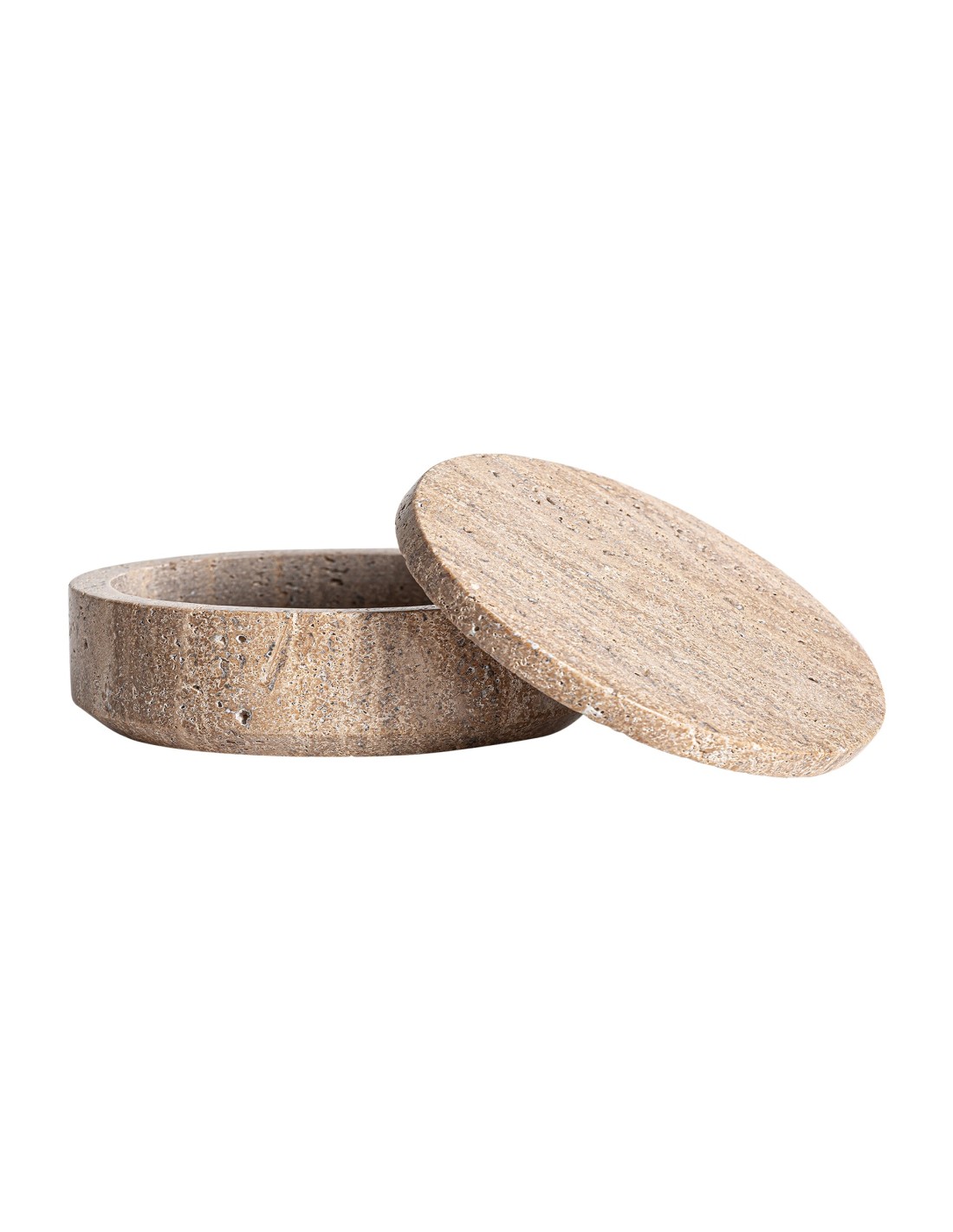 El travertino color crema aporta luminosidad y sofisticación discreta. Cada caja es única gracias a la textura mineral natural, que convierte la pieza en un accesorio decorativo funcional.
