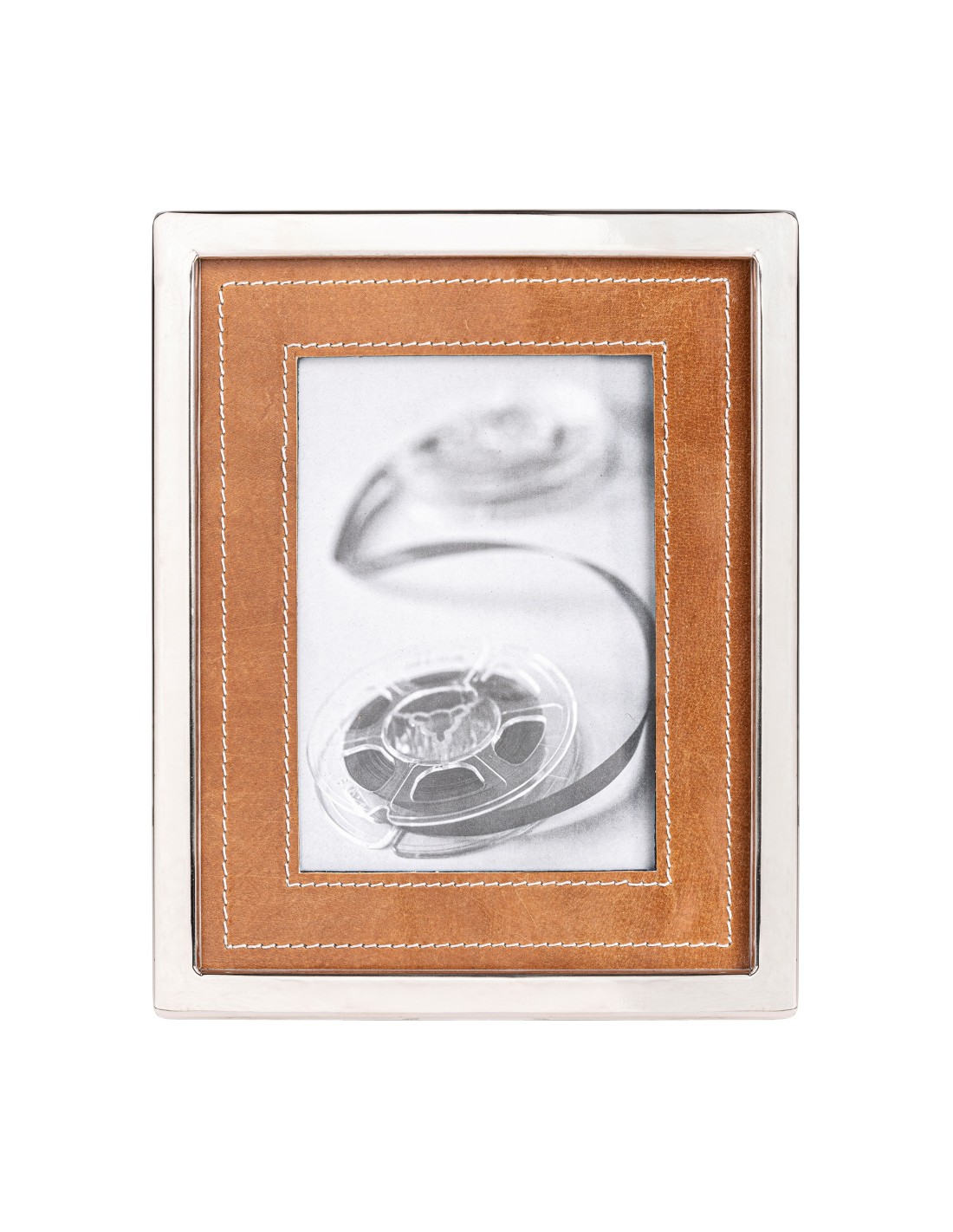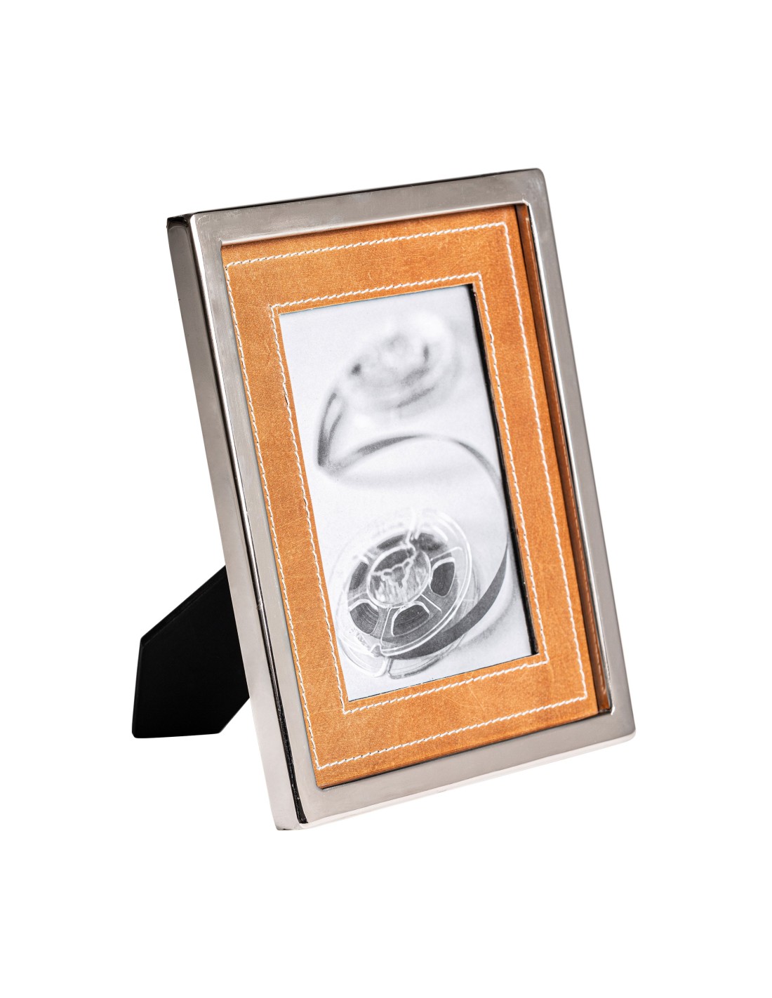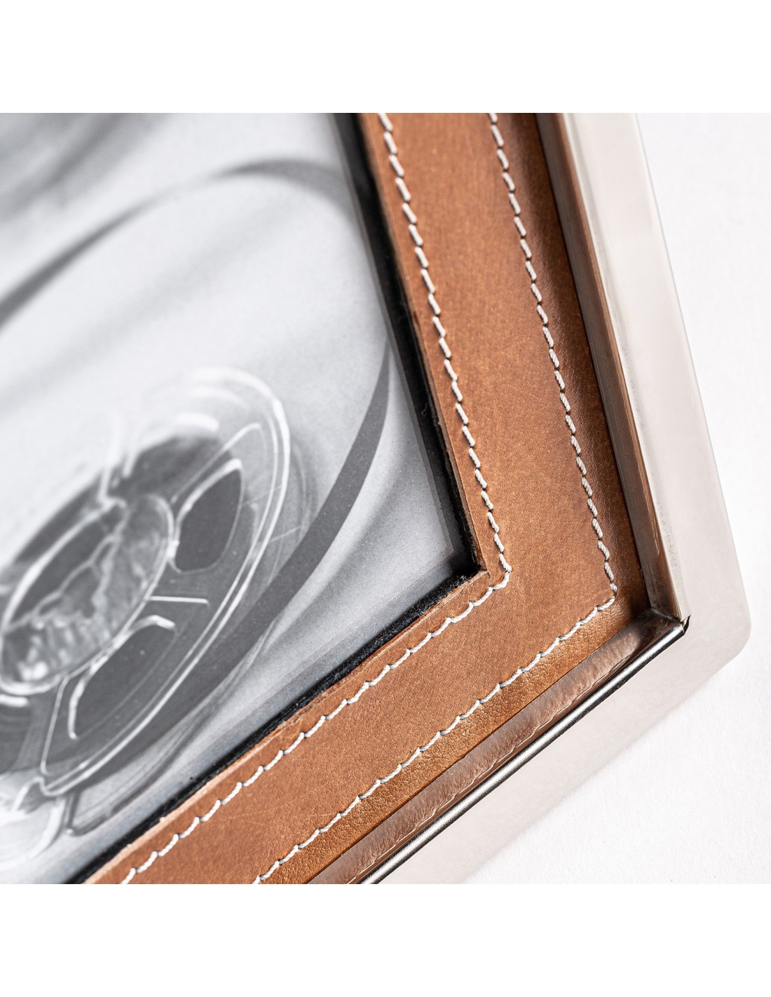 MARCO DE FOTO RECTANGULAR HELIVE, EN COLOR PLATA LISO, DE ESTILO CONTEMPORÁNEO. FABRICADO EN DM, COMBINADO CON PIEL Y ACERO. PIEL VACA.