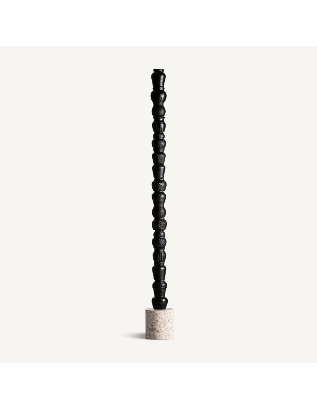 Figura decorativa Soma de diseño minimalista, fabricada en terracota negra con acabado mate, base de mármol beige y detalles en aluminio. Pieza desmontable de gran altura, perfecta para interiores modernos y elegantes.