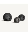 Su cuerpo en terracota negra con acabado mate aporta textura sobria y moderna, mientras que la base de mármol beige introduce un contraste sutil y refinado. El toque metálico del aluminio eleva su diseño hacia un estilo sofisticado y atemporal.
