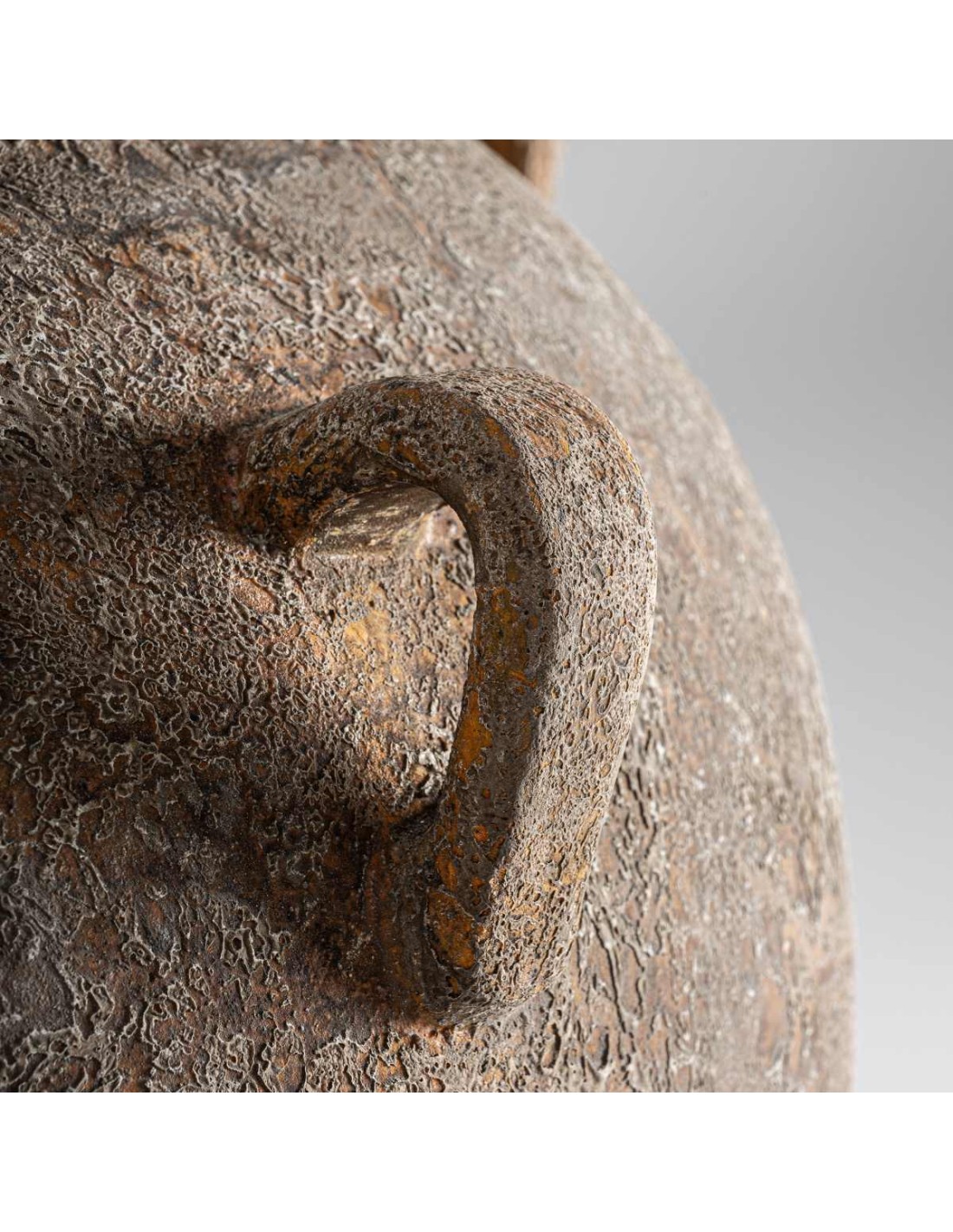 Ánfora decorativa de estilo clásico, fabricada en hormigón armado con acabado envejecido en tonos marrones. Una pieza robusta y elegante de Vical Home, perfecta para interiores y exteriores cubiertos.