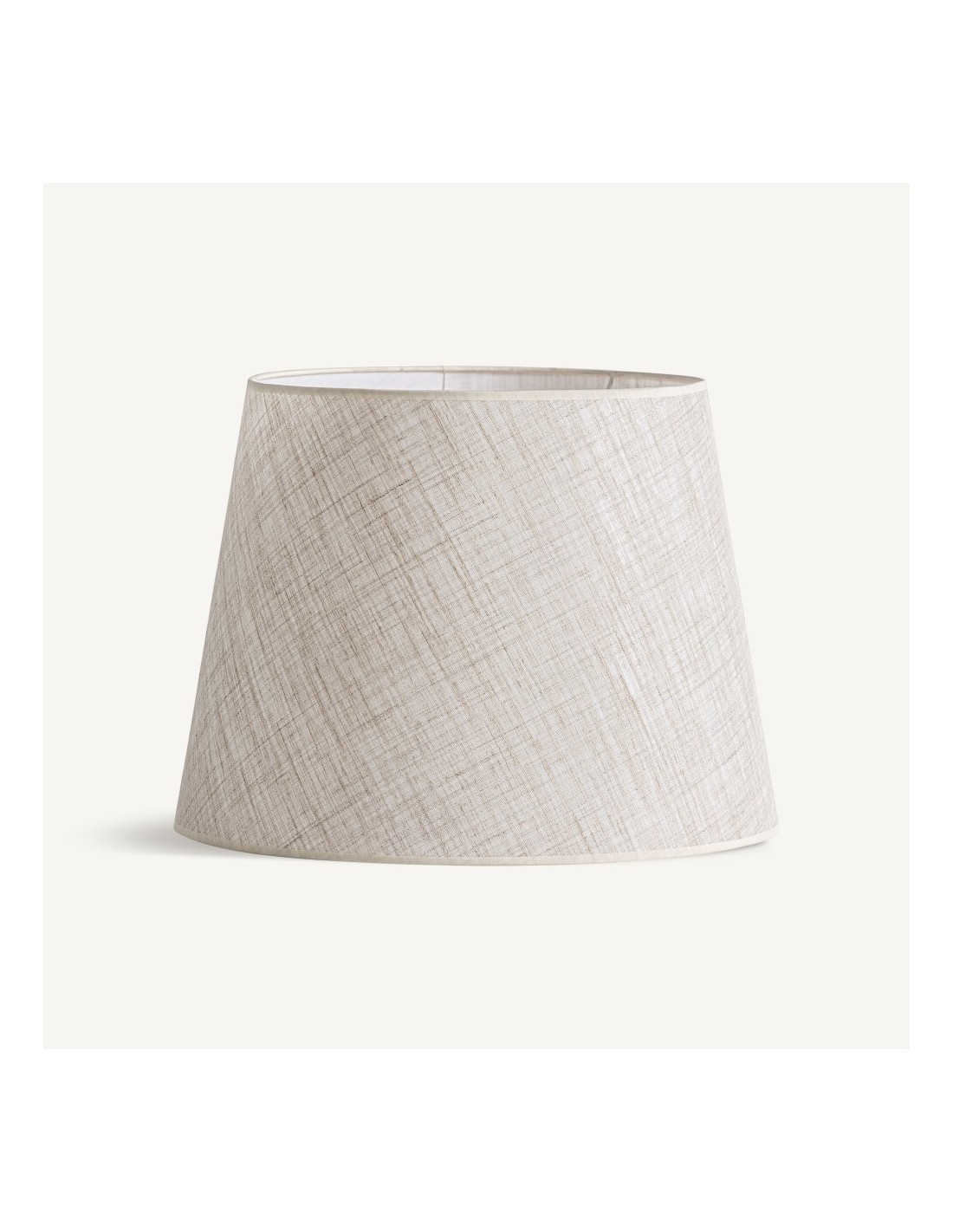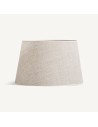 La pantalla está fabricada en lino de tono blanco roto, un material natural que aporta textura, luminosidad suave y un acabado refinado. La estructura de hierro proporciona robustez y carácter, incorporando un toque industrial-elegante que se adapta a múltiples estilos decorativos.