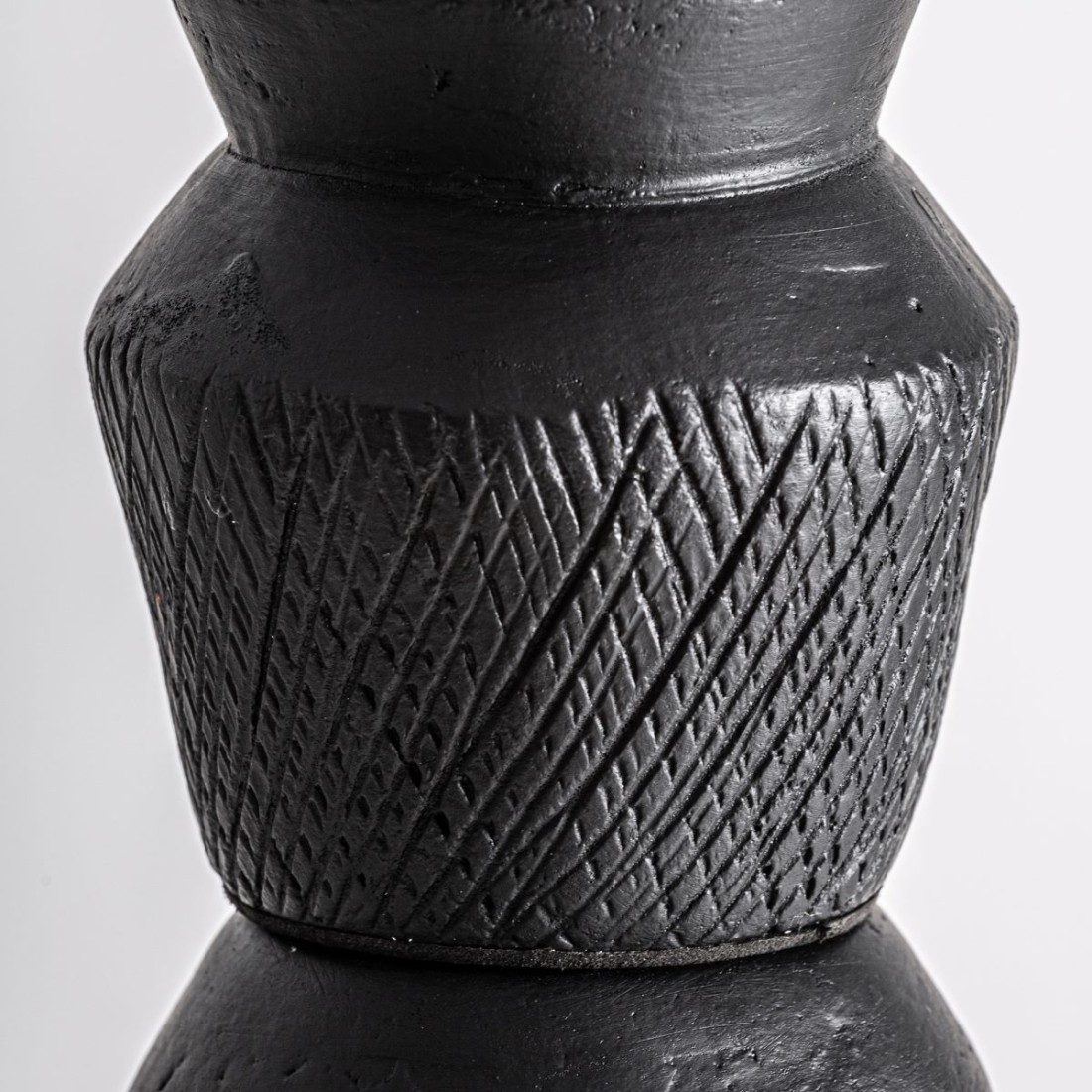 La Escultura alta Soma destaca por su verticalidad imponente y su composición de materiales nobles. La terracota negra aporta profundidad y carácter, mientras que la base o detalles en mármol y aluminio introducen contraste y elegancia contemporánea.