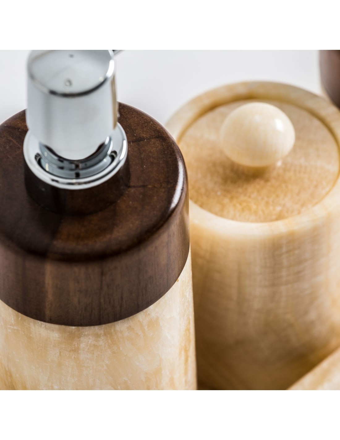 SET DE ASEO J/4 NEPTUNO, EN COLOR MARFIL, DE ESTILO CONTEMPORÁNEO. FABRICADO EN ONIX, COMBINADO CON MADERA DE ÉBANO.