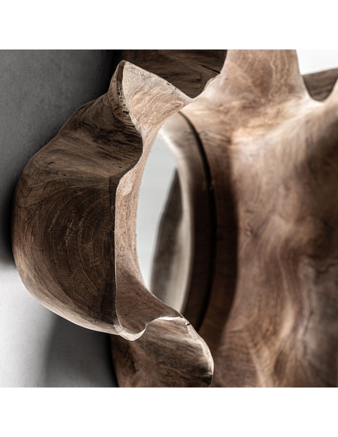 Su diseño robusto y compacto lo convierte en un elemento decorativo ideal para entradas, salones, dormitorios o baños. La profundidad del marco de 13 cm realza el volumen del espejo y aporta una presencia escultórica que no pasa desapercibida.