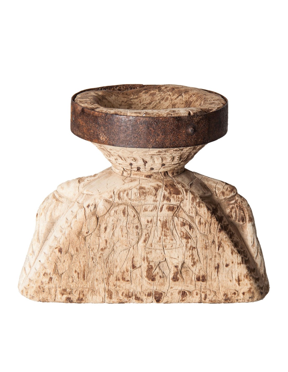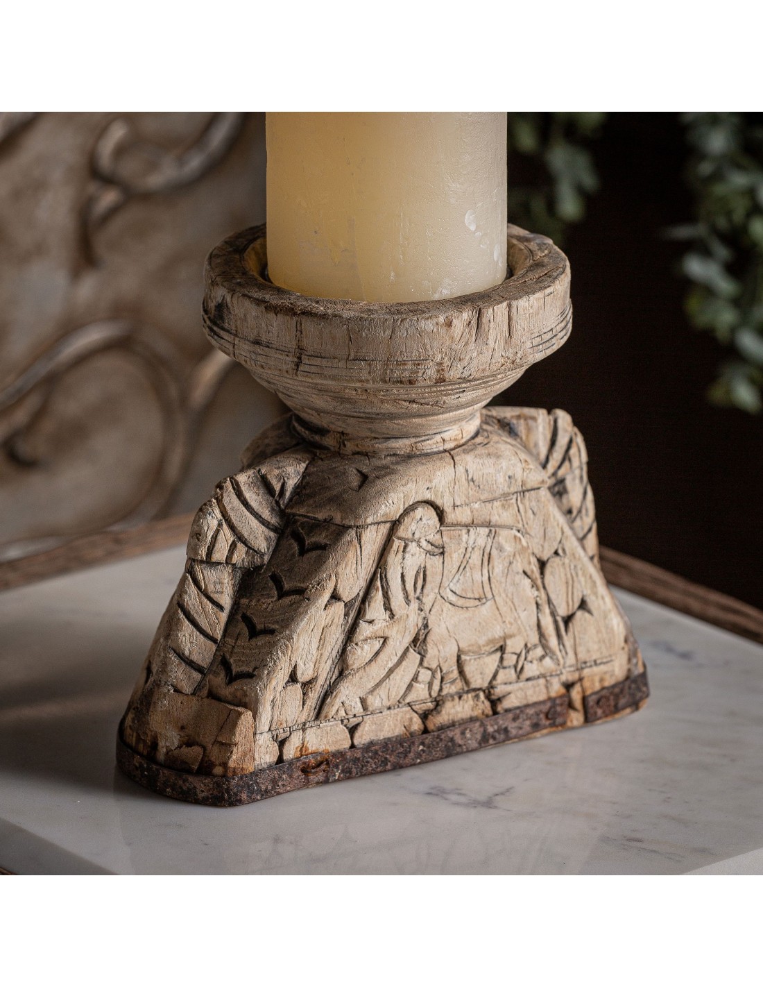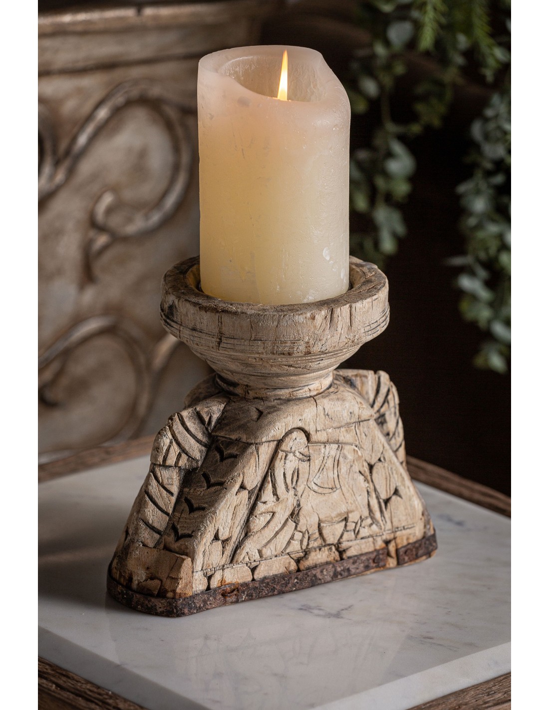 PORTAVELA SEMICIRCULAR, EN COLOR BLANCO ROTO ENVEJECIDO, DE ESTILO ÉTNICO. FABRICADO EN MADERA DE TEKA, COMBINADO CON HIERRO.