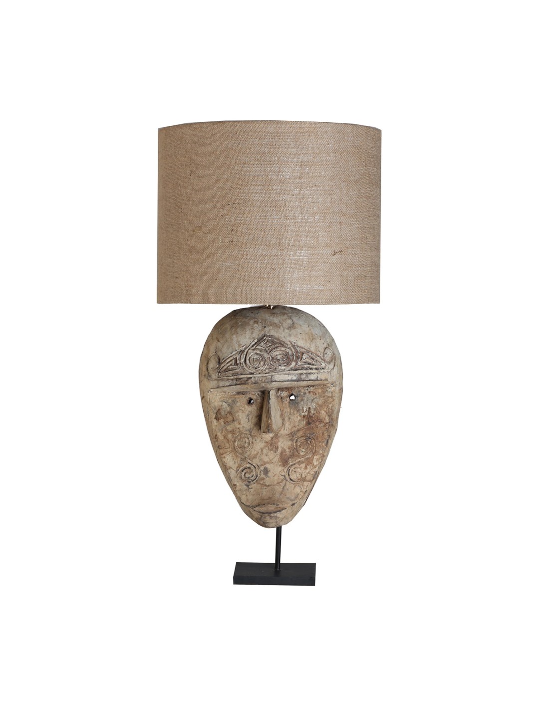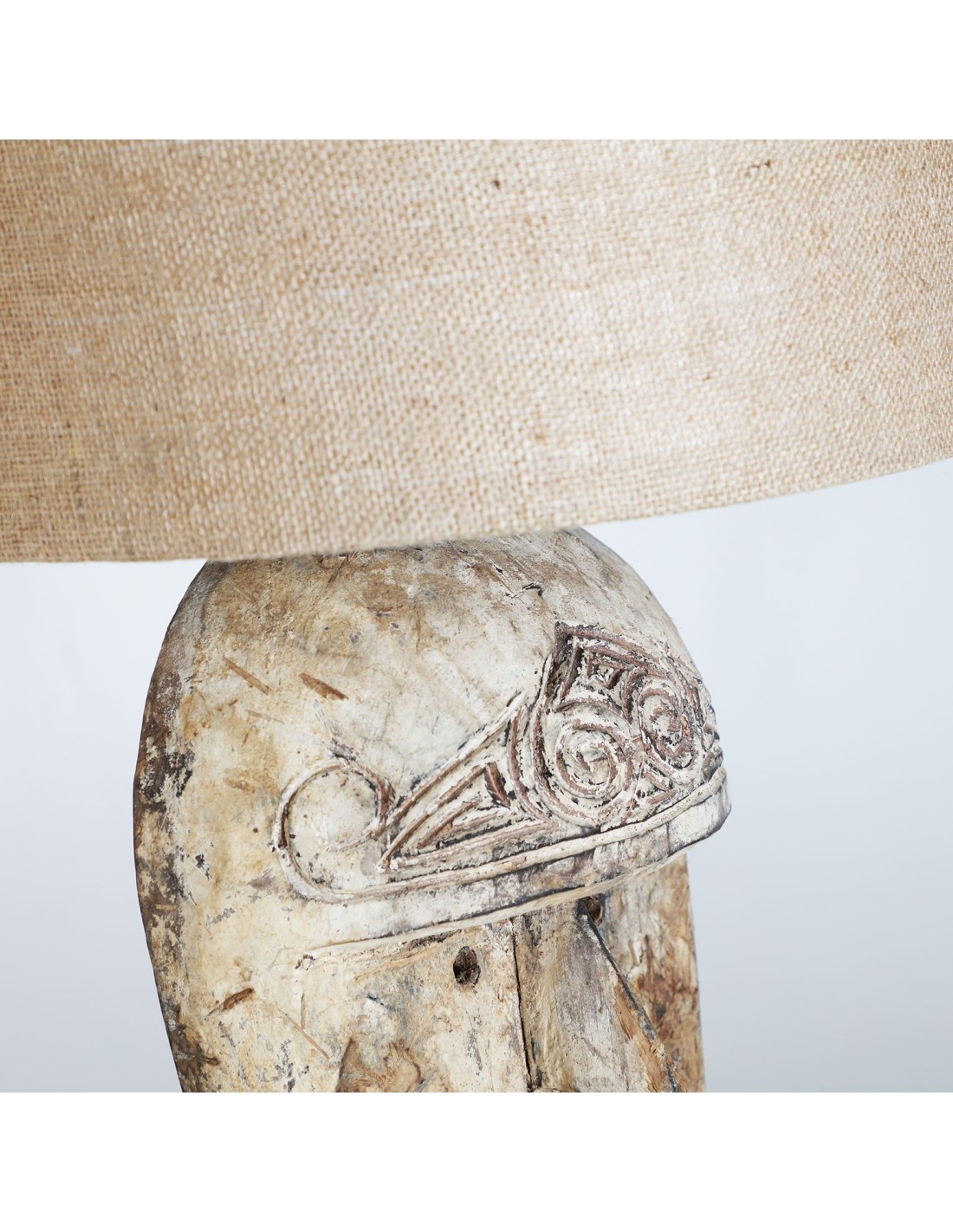 LÁMPARA DE SOBREMESA, EN COLOR MARRÓN ENVEJECIDO, DE ESTILO ÉTNICO. FABRICADO EN MADERA TROPICAL, COMBINADO CON YUTE.