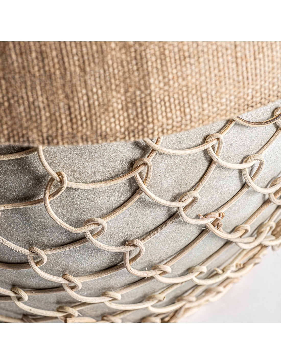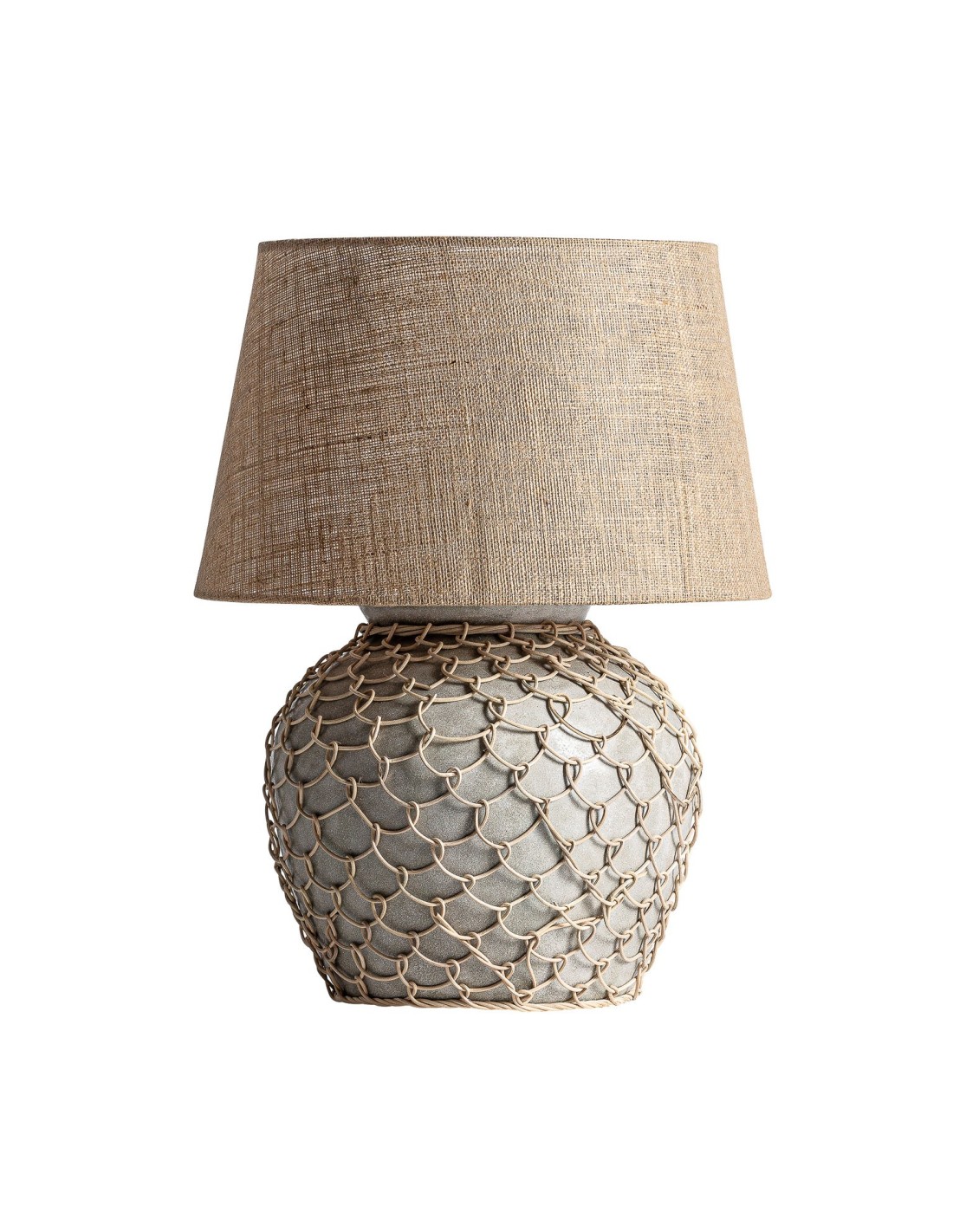 LÁMPARA DE SOBREMESA, EN COLOR GRIS/CREMA, DE ESTILO CONTEMPORÁNEO. FABRICADO EN CEMENTO, COMBINADO CON RATÁN Y YUTE. PRODUCTO DESMONTABLE.