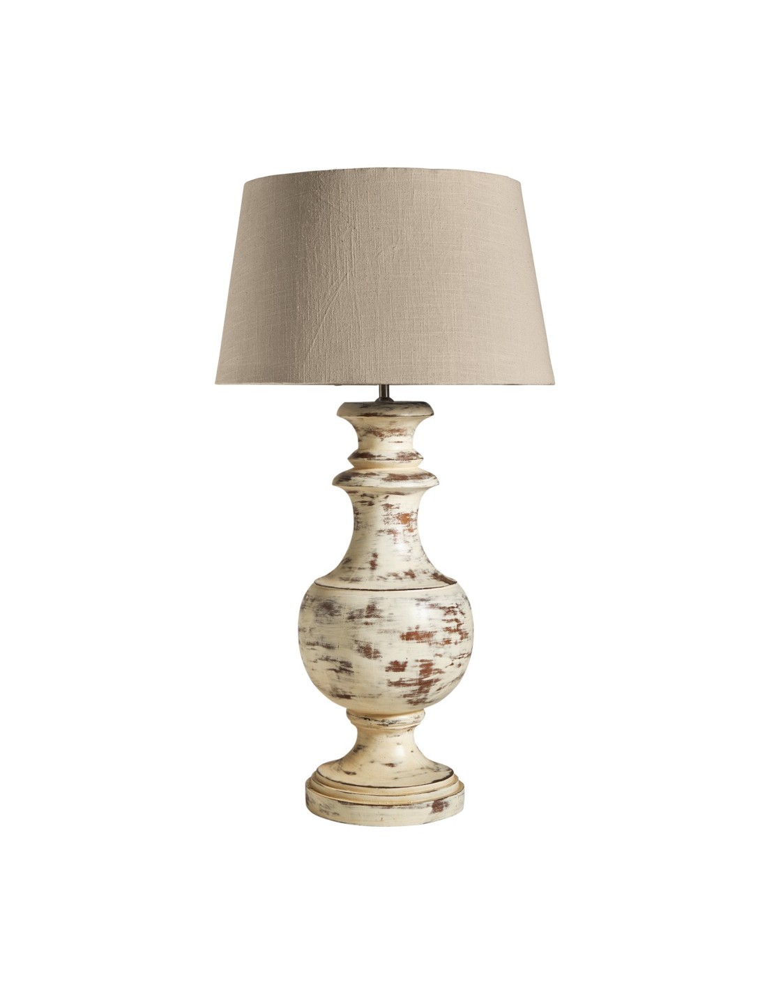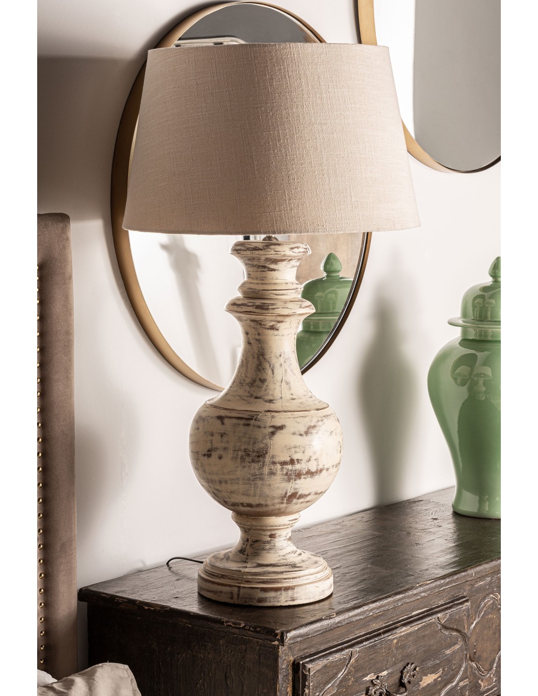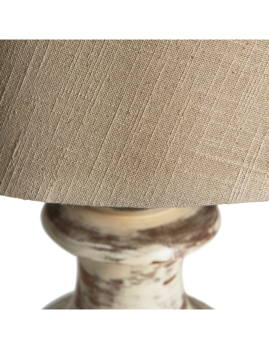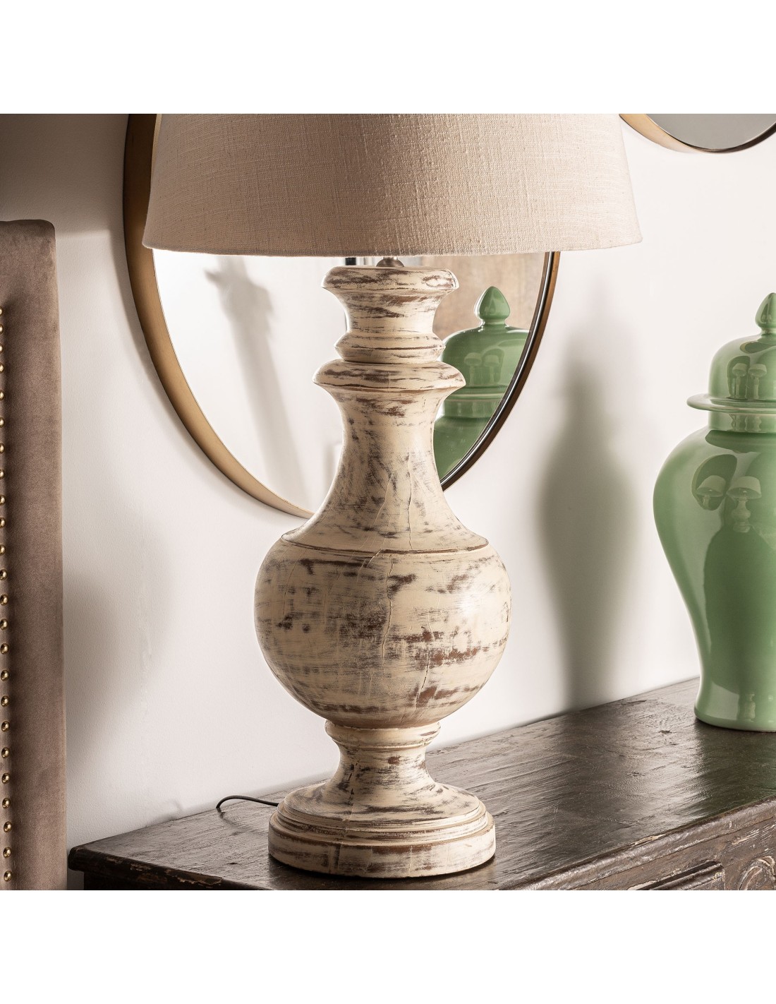 LÁMPARA DE SOBREMESA, EN COLOR BLANCO DECAPADO, DE ESTILO PROVENZAL. FABRICADO EN MADERA DE MANGO, COMBINADO CON ALGODÓN.