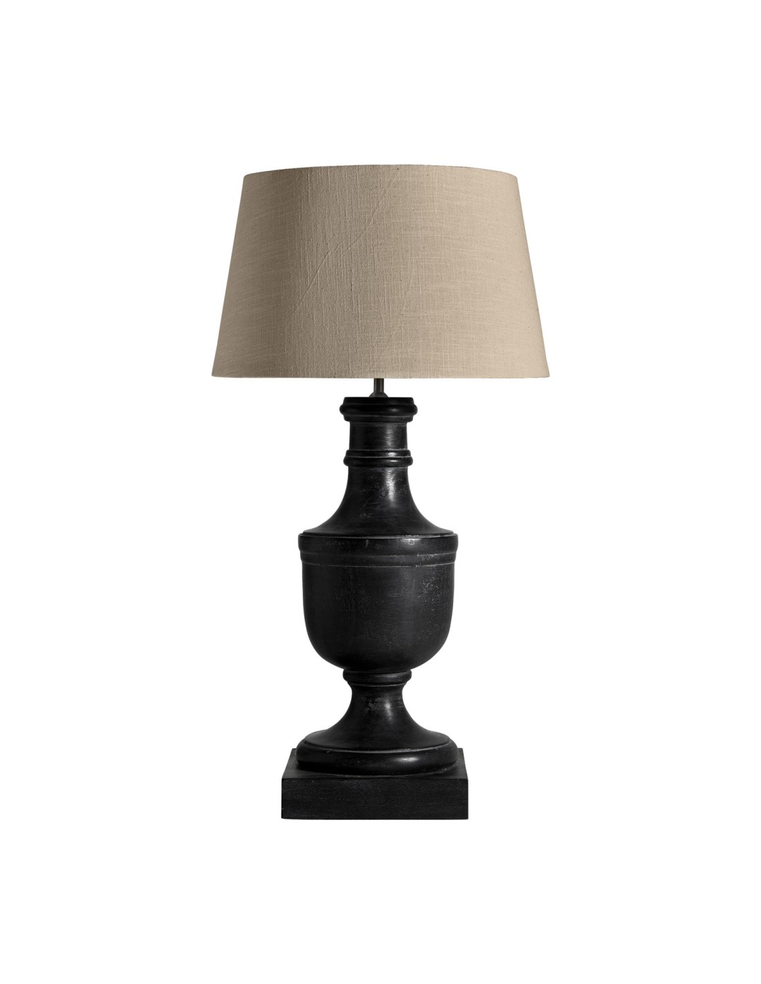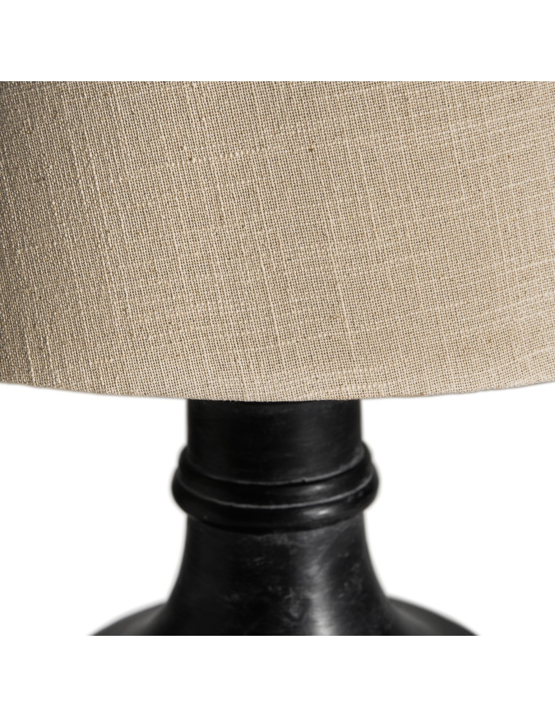 LÁMPARA DE SOBREMESA, EN COLOR NEGRO DECAPADO, DE ESTILO PROVENZAL. FABRICADO EN MADERA DE MANGO, COMBINADO CON ALGODÓN.