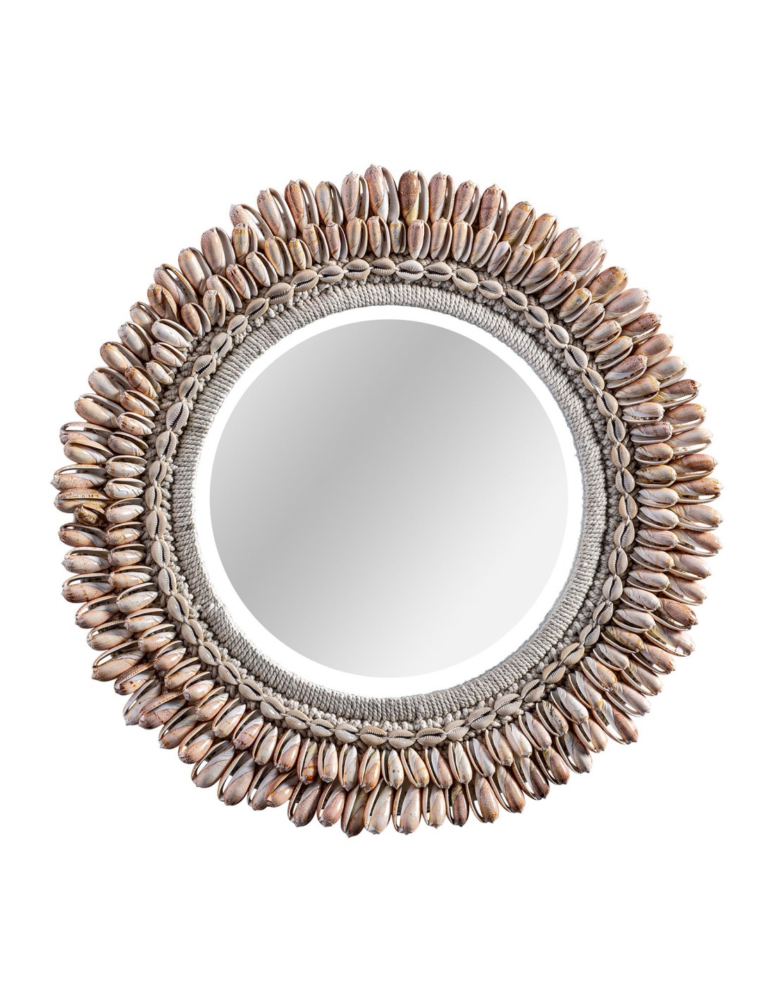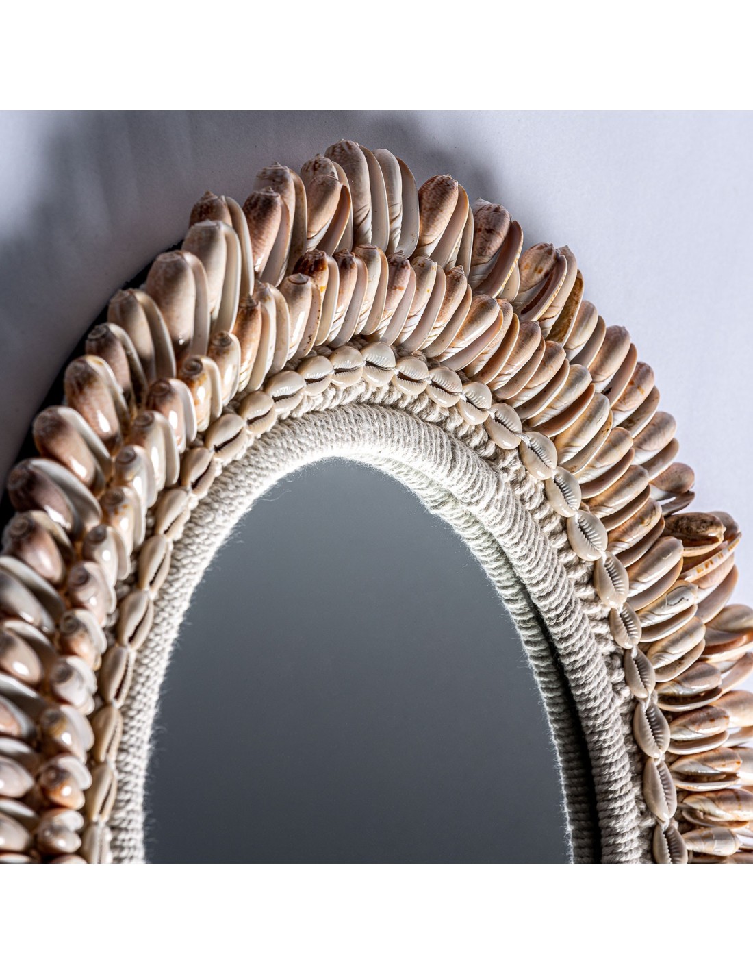 ESPEJO REDONDO DHYL, EN COLOR MARFIL, DE ESTILO ÉTNICO. FABRICADO EN CONCHA, COMBINADO CON CUERDA Y ESPEJO.