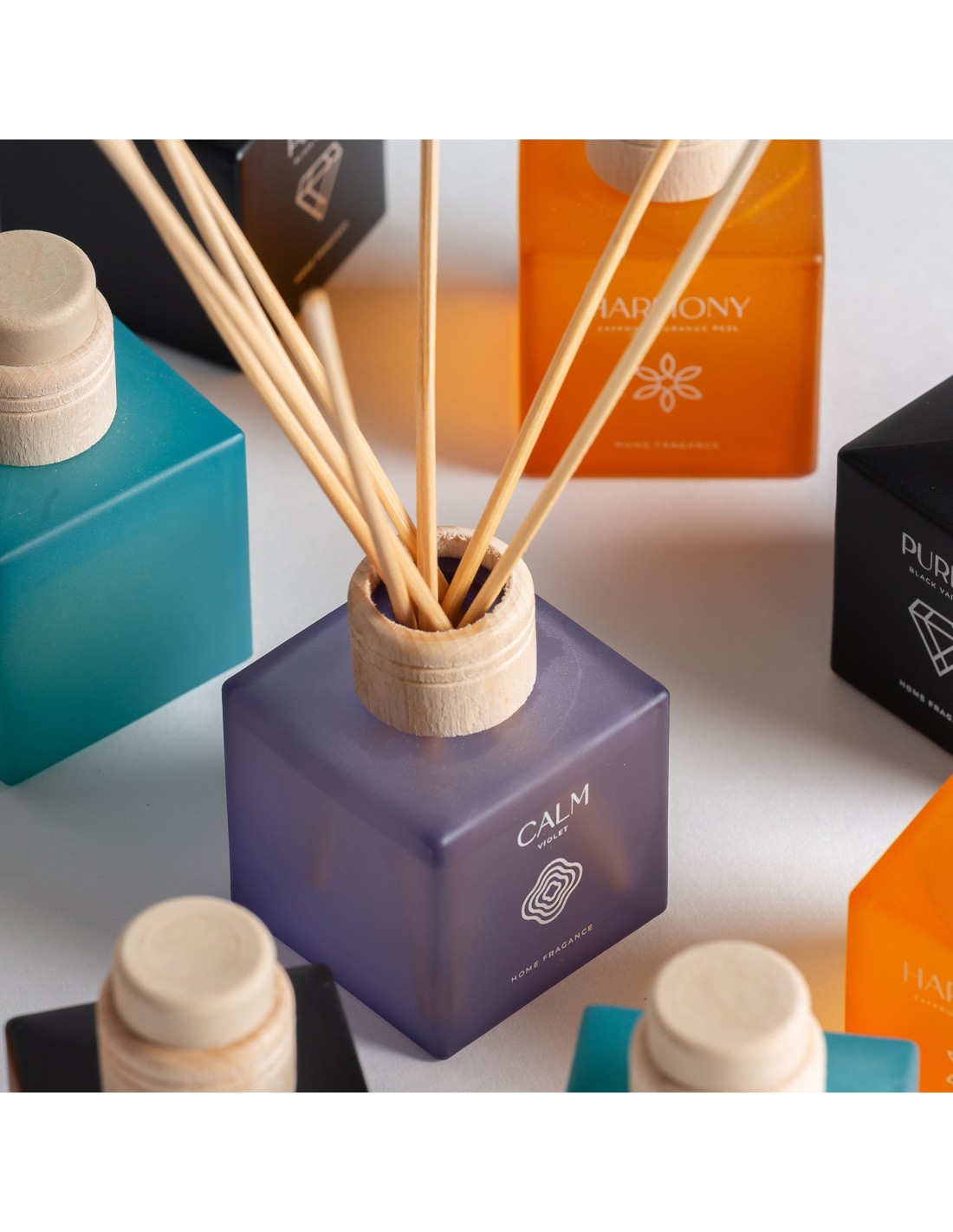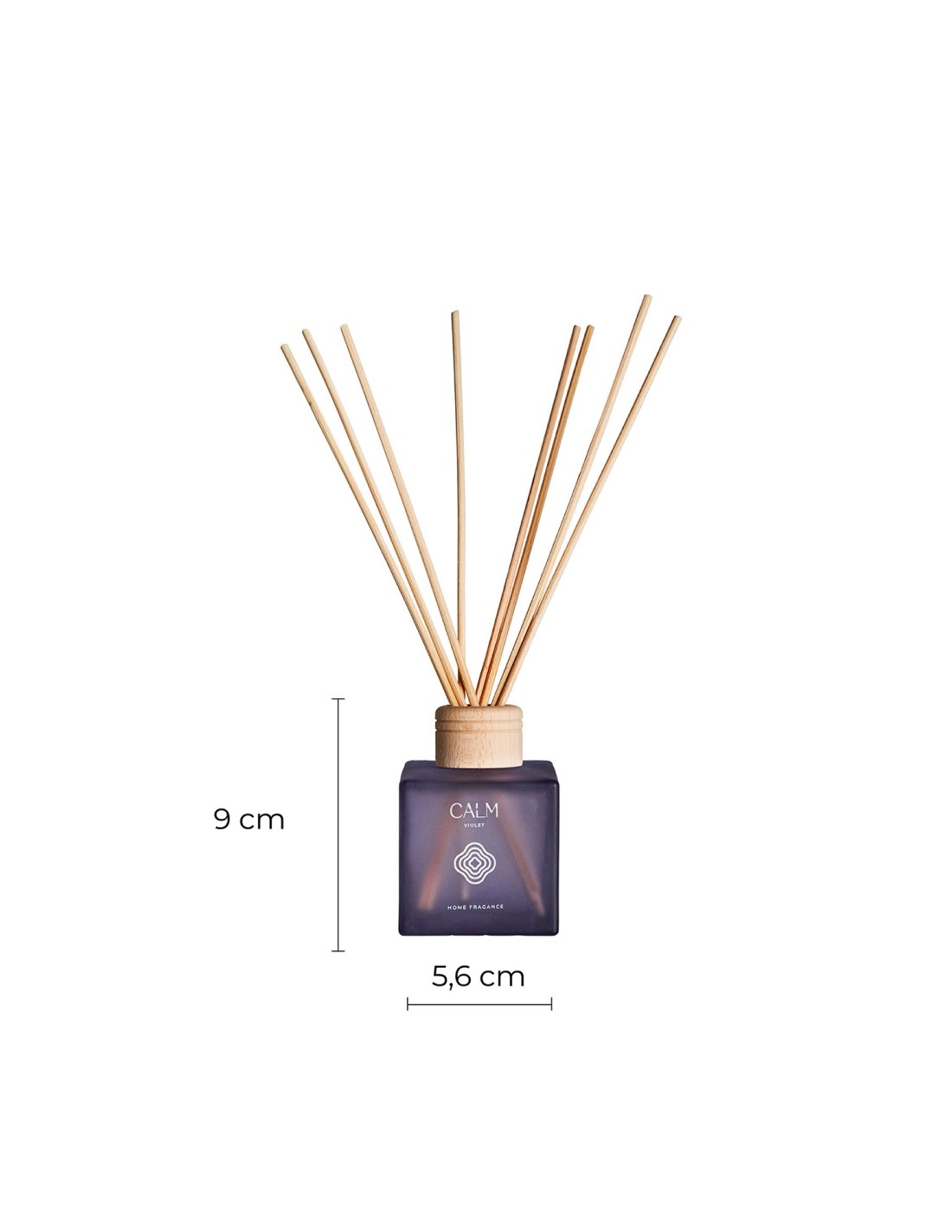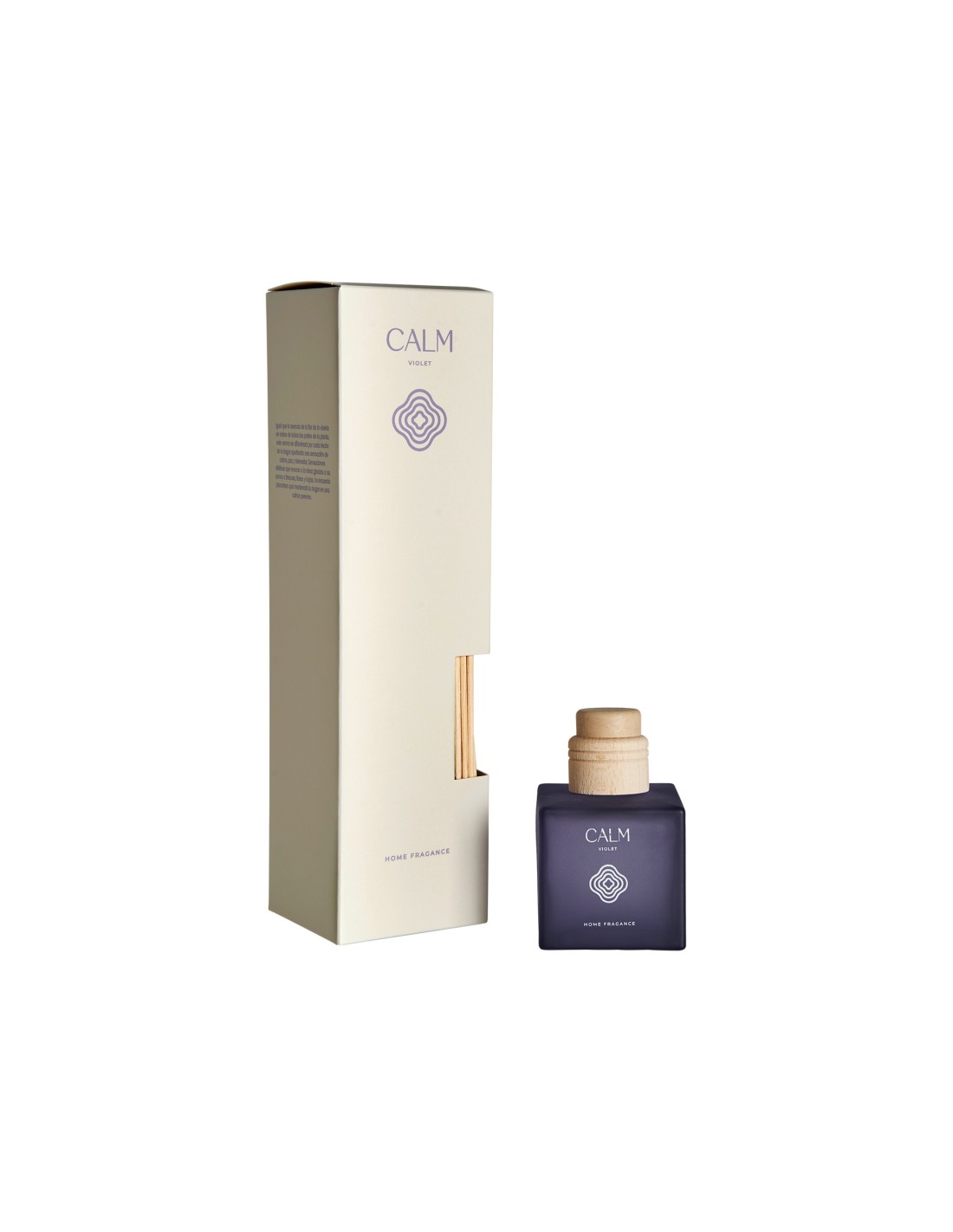 MIKADO CALM, EN COLOR MORADO, DE ESTILO SHABBY CHIC. FABRICADO EN VIDRIO, COMBINADO CON MADERA DE HAYA Y RATÁN. 75% ALCOHOL DESNATURALIZADO LOCIÓN YBK, A 96º - 25% VIOLETA DE NENUFAR.