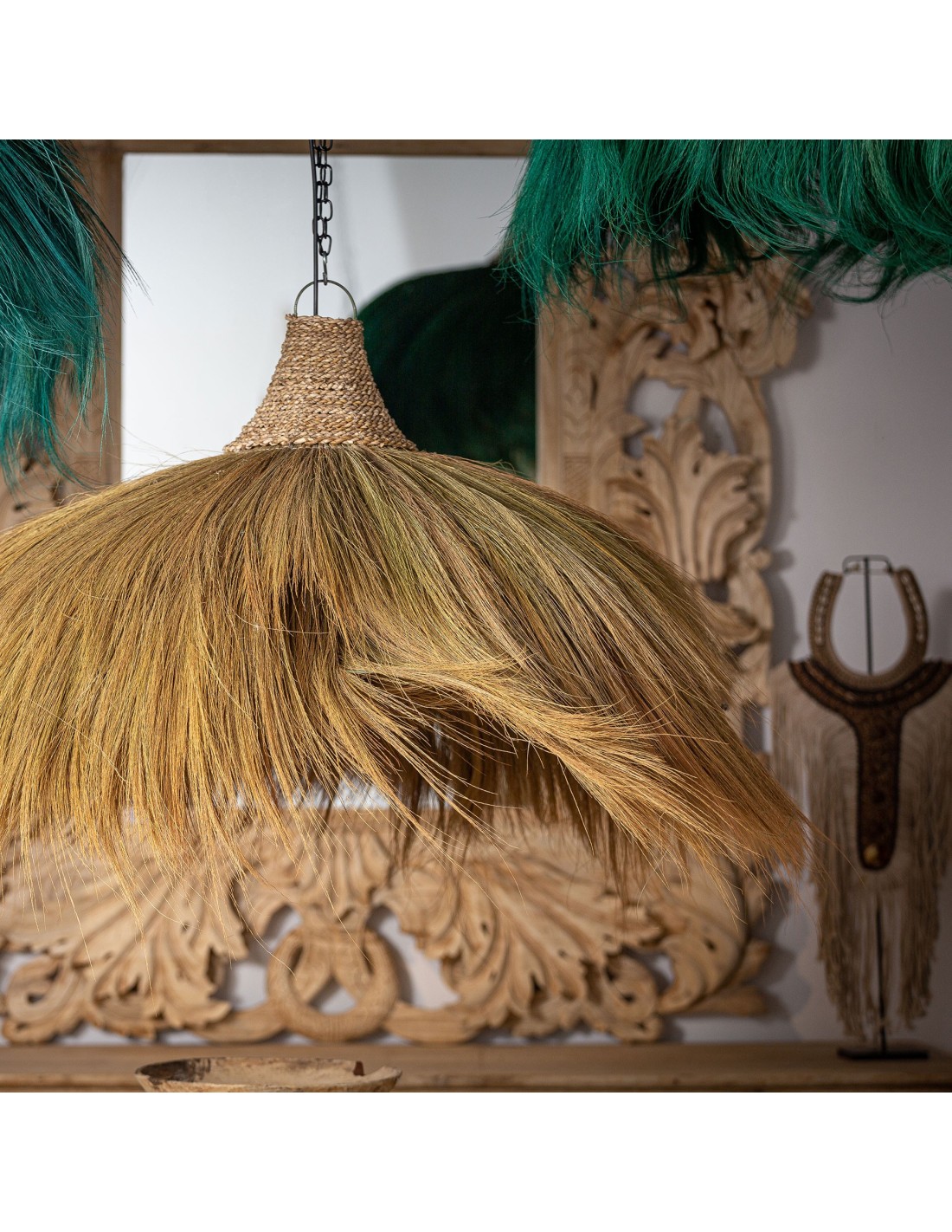 LÁMPARA DE COLGAR SINKO, EN COLOR MARRÓN, DE ESTILO ÉTNICO. FABRICADO EN FIBRA NATURAL, COMBINADO CON HIERRO.