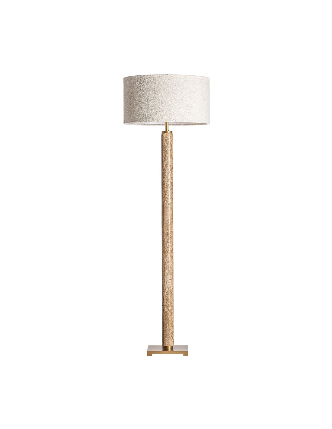 Esta lámpara está fabricada con base de mármol crema, estructura en acero color oro y pantalla de algodón bouclé blanco roto para una iluminación suave.