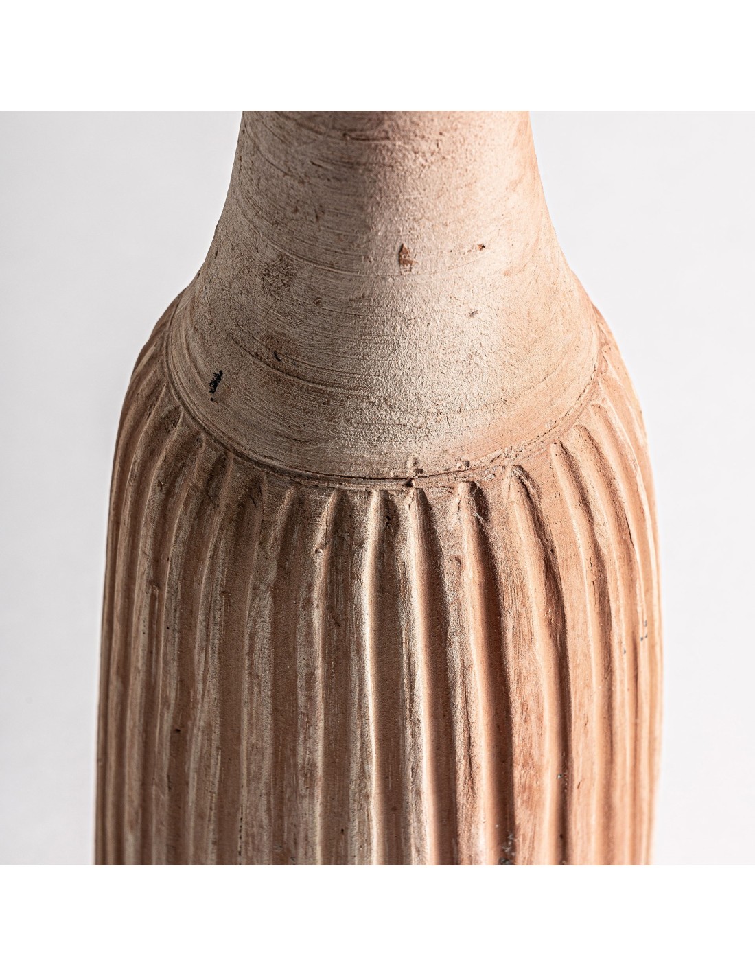 Fabricado en arcilla con acabado envejecido en tono marrón claro, este jarrón destaca por su apariencia natural y su estética orgánica. El acabado ligeramente irregular aporta profundidad visual y un encanto artesanal, perfecto para interiores que buscan una decoración auténtica.