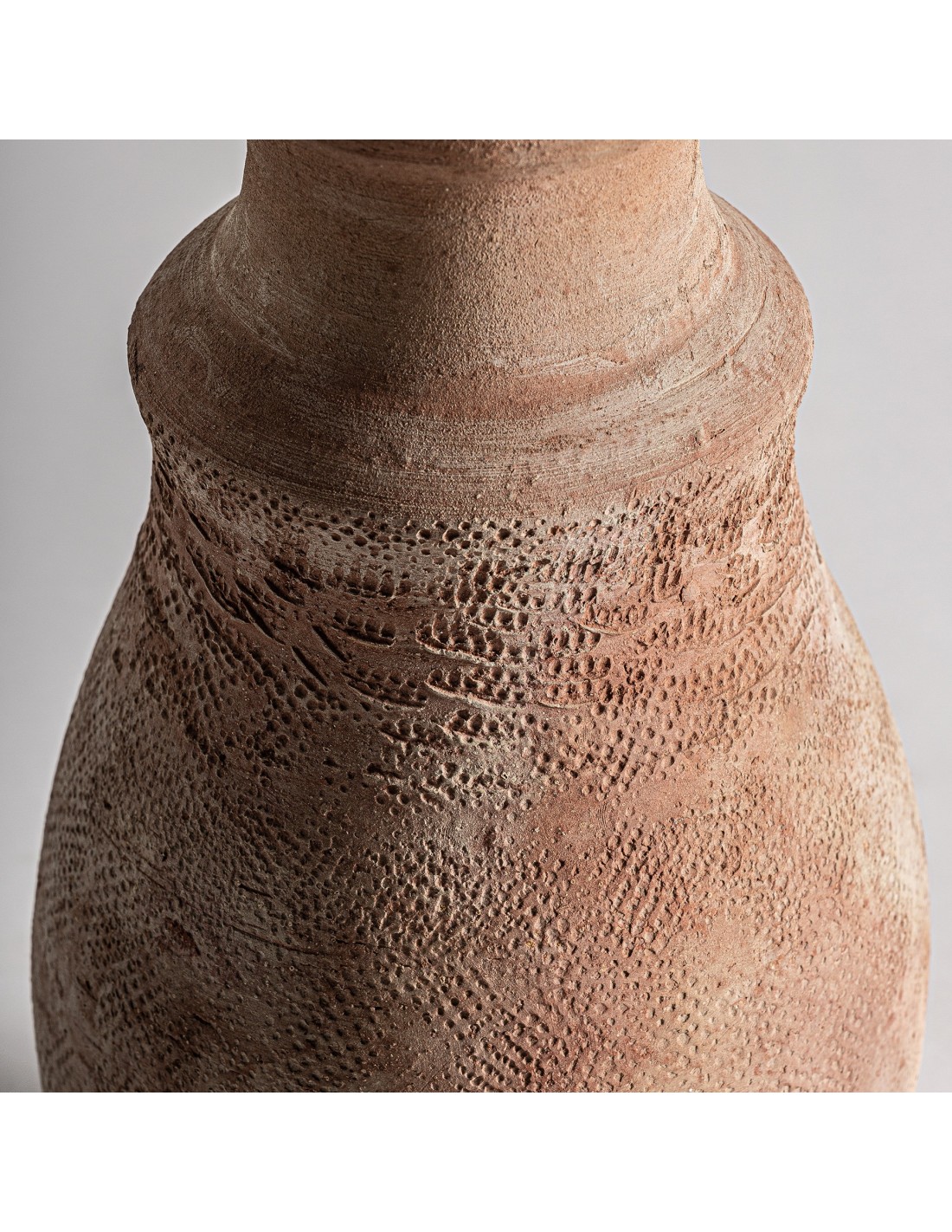 Fabricado en terracota de tono marrón claro, este jarrón aporta una estética artesanal que encaja perfectamente en decoraciones mediterráneas, rústicas o contemporáneas con inspiración natural. Su acabado mate y su textura ligeramente irregular reflejan el carácter auténtico de este material tradicional.