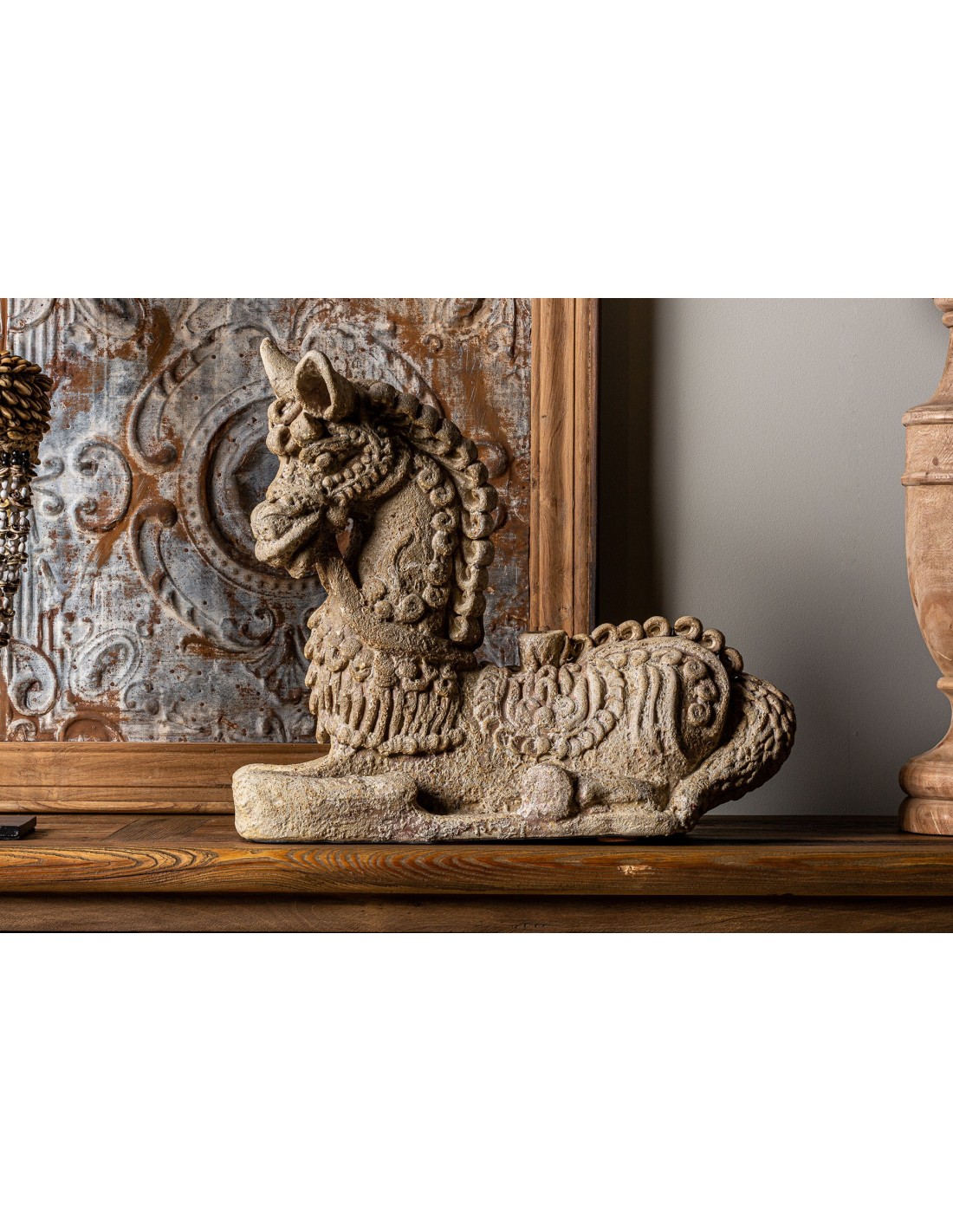 FIGURA DECORATIVA CABALLO, EN COLOR TONOS EN VERDE ENVEJECIDO, DE ESTILO ORIENTAL. FABRICADO EN TERRACOTA.