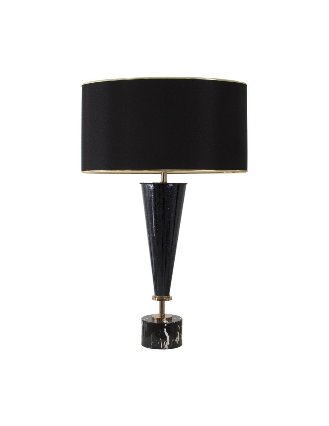 LÁMPARA DE SOBREMESA, EN COLOR NEGRA, DE ESTILO CLÁSICO. FABRICADO EN HIERRO, COMBINADO CON VIDRIO Y LINO.