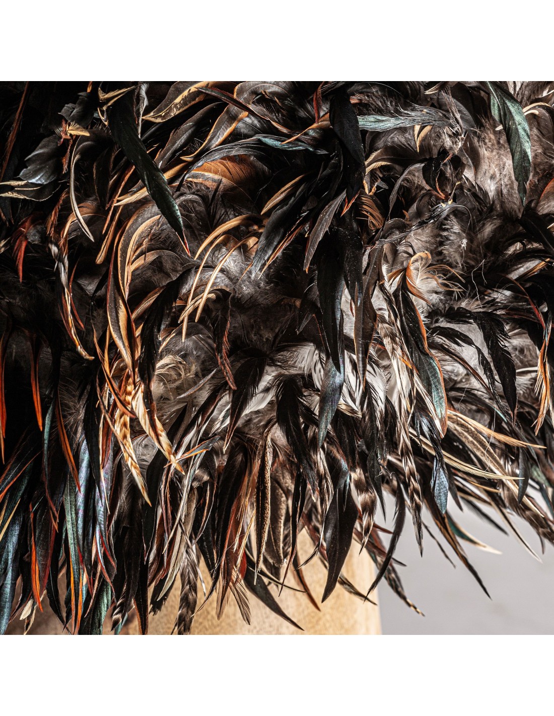 LÁMPARA DE SOBREMESA GHEDAS, EN COLOR MARRÓN ENVEJECIDO, DE ESTILO ÉTNICO. FABRICADO EN MADERA DE TEKA, COMBINADO CON PLUMAS. . PRODUCTO ELEVABLE.