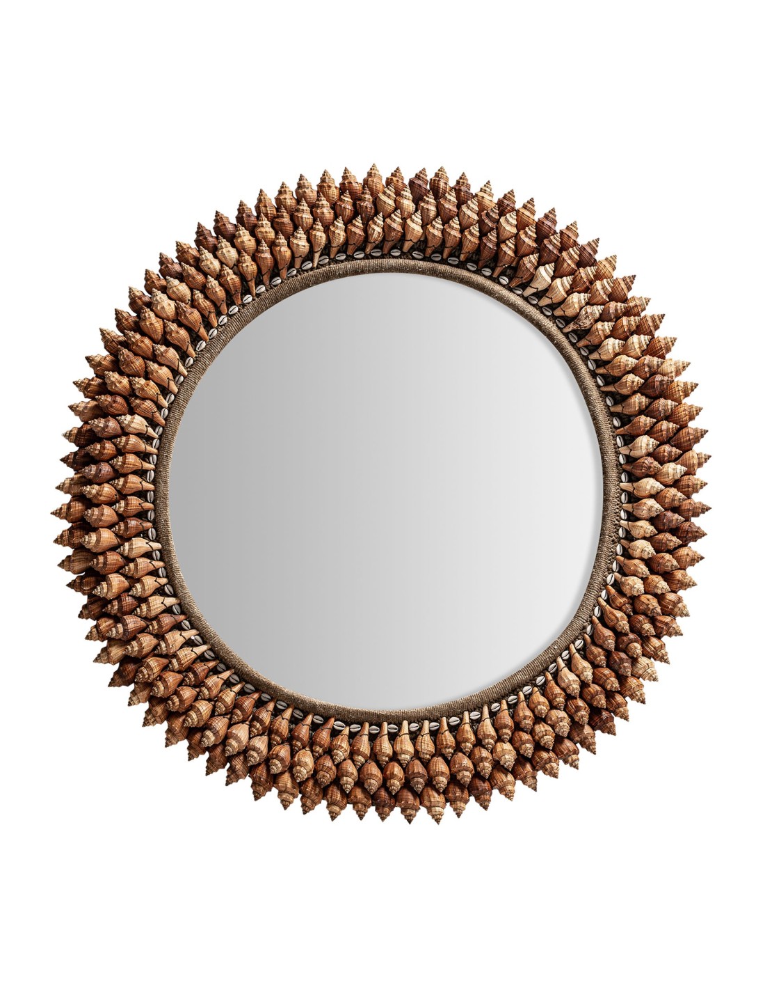 ESPEJO REDONDO CARACOLAS, EN COLOR TONOS EN MARRÓN, DE ESTILO ÉTNICO. FABRICADO EN ESPEJO, COMBINADO CON CONCHA Y MADERA DM.