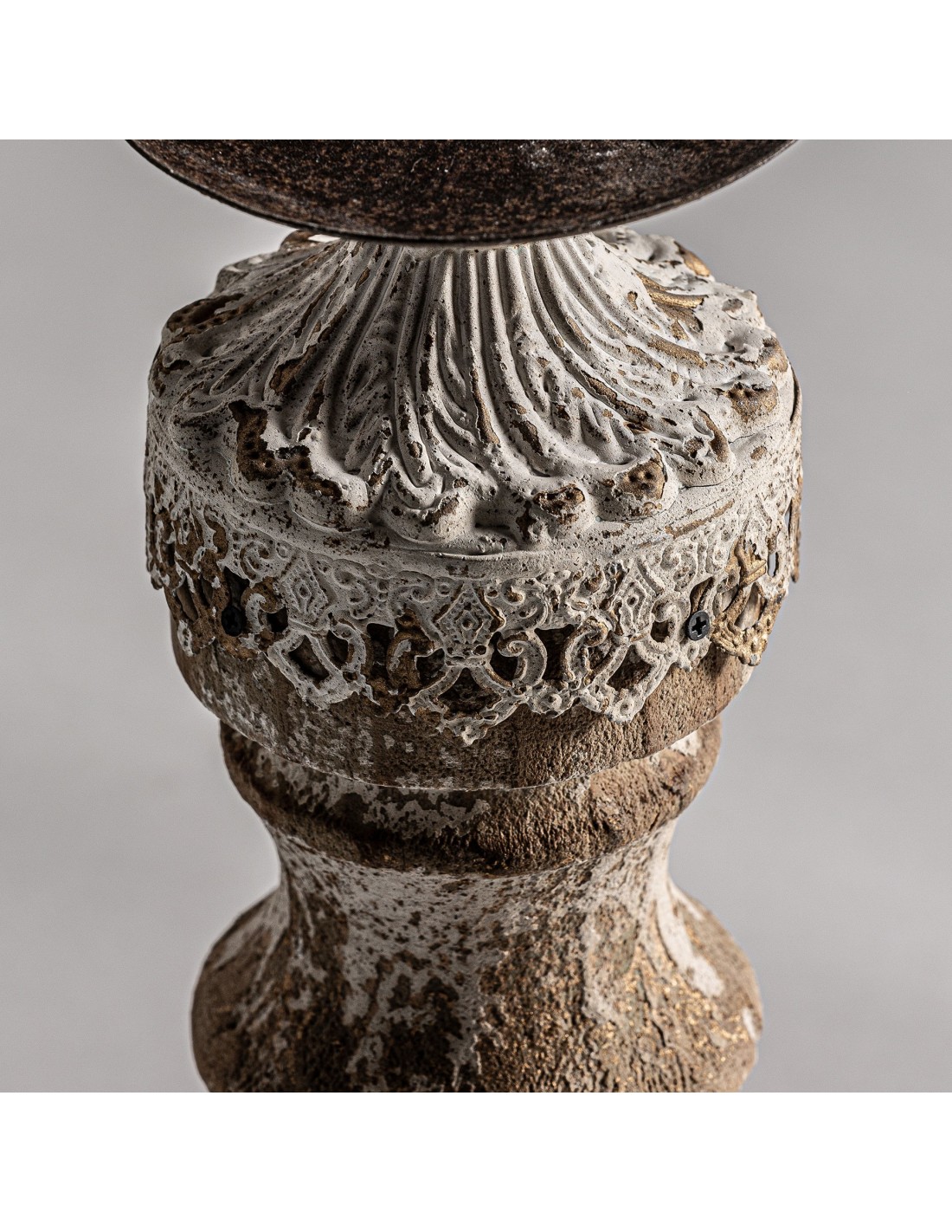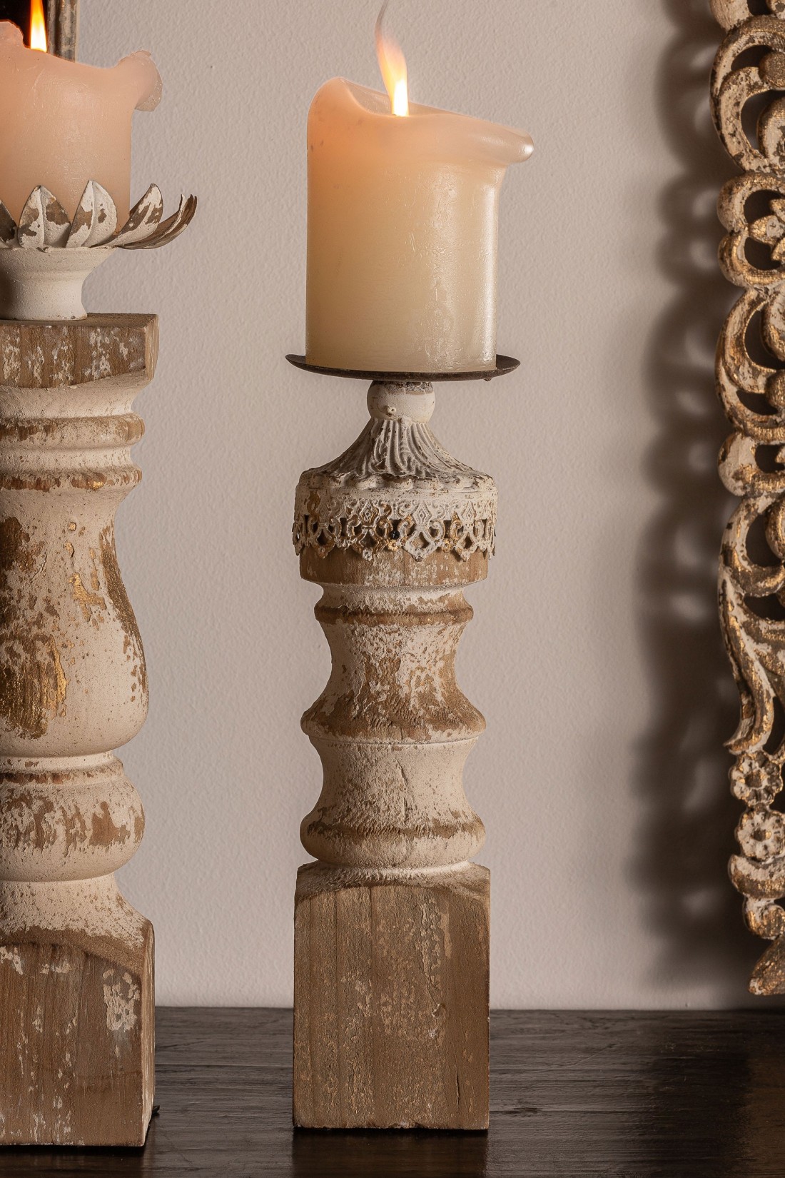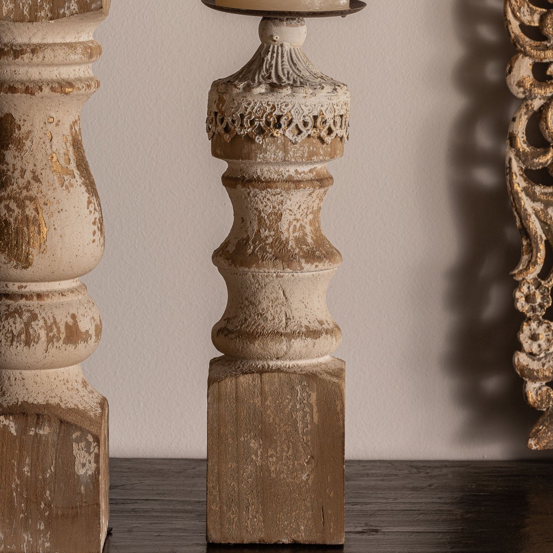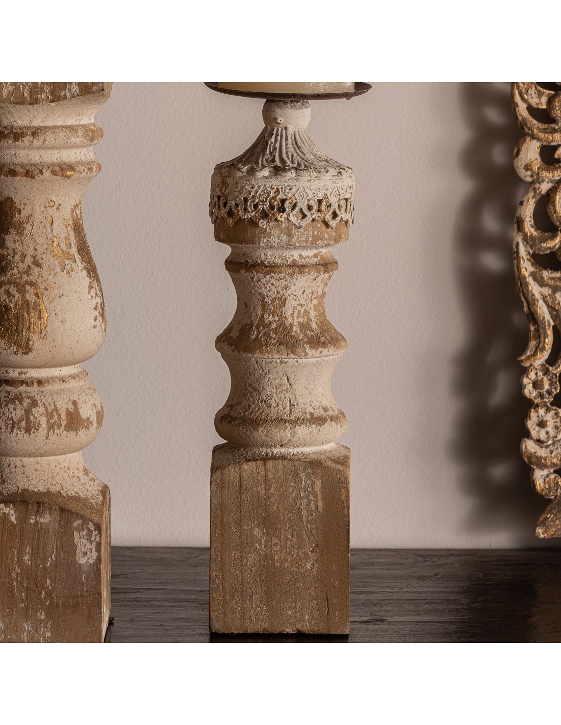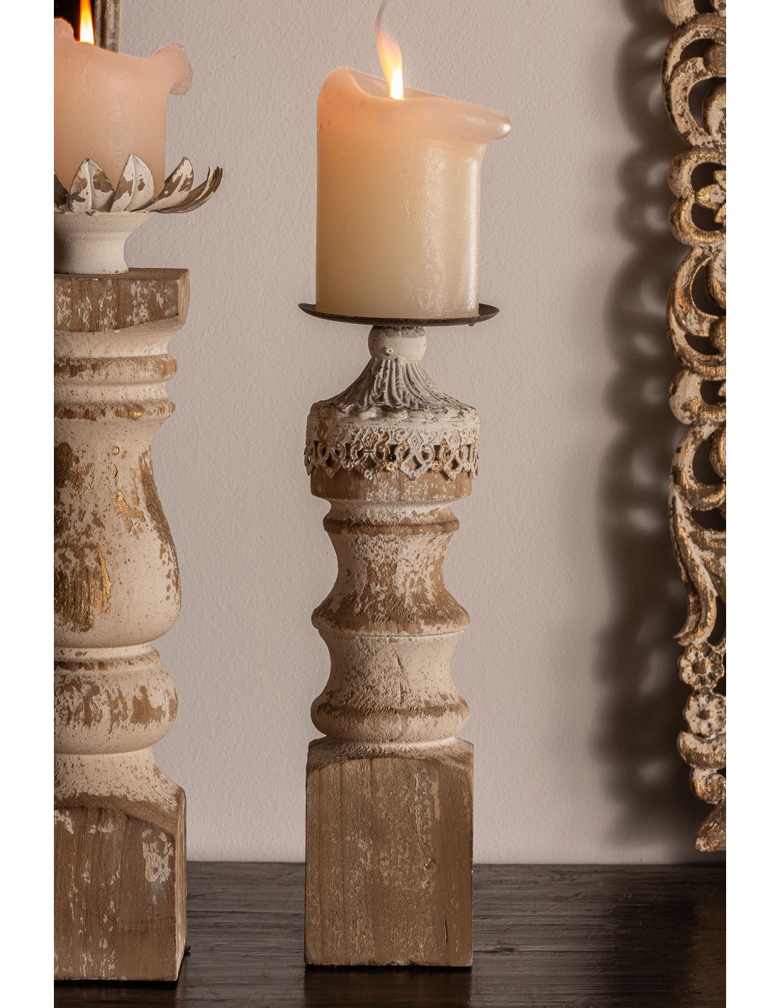 PORTAVELA, EN COLOR MARRÓN ENVEJECIDO, DE ESTILO COLONIAL. FABRICADO EN HIERRO, COMBINADO CON MADERA DE ABETO.