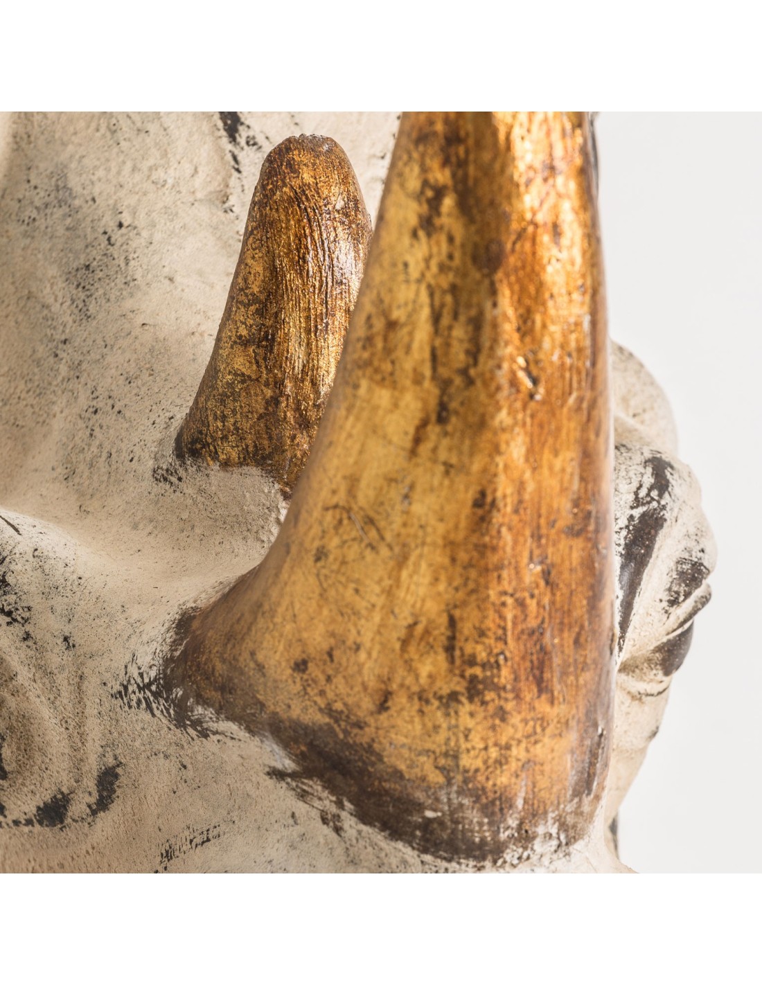 FIGURA DECORATIVA RINOCERONTE, EN COLOR CREMA/ORO ANTIC, DE ESTILO NÓRDICO. FABRICADO EN RESINA.