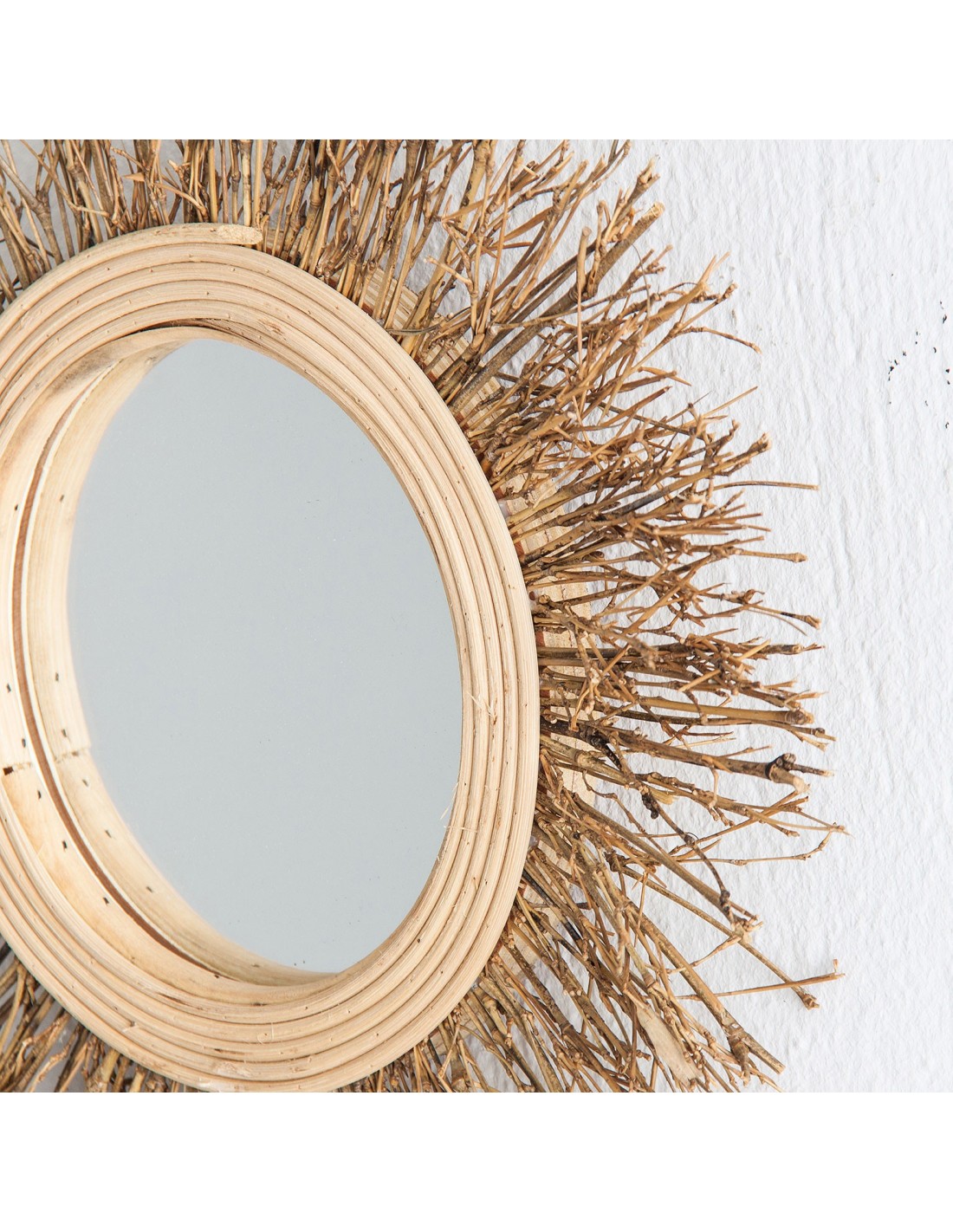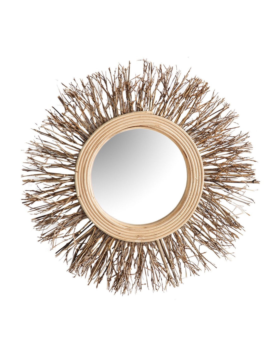 ESPEJO REDONDO KAIL, EN COLOR MARRÓN, DE ESTILO ÉTNICO. FABRICADO EN BAMBÚ, COMBINADO CON ESPEJO Y MADERA CONTRACHAPADA.