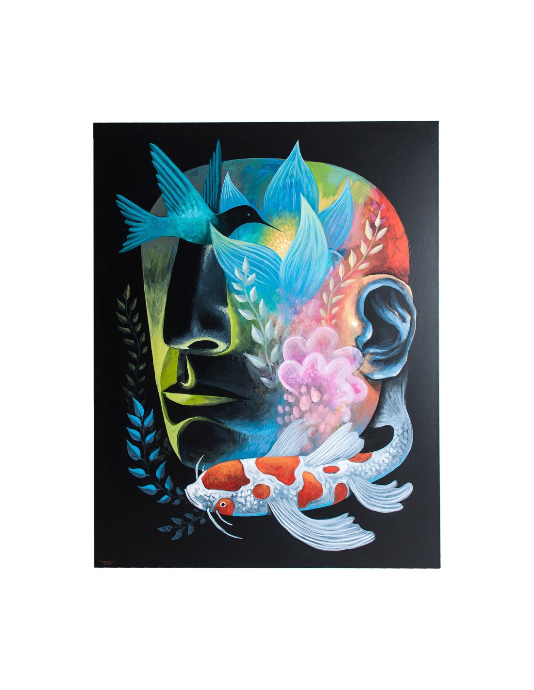 LIENZO RECTANGULAR NAEL, EN COLOR MULTICOLOR ARTESANAL, DE ESTILO CONTEMPORÁNEO. FABRICADO EN LIENZO, COMBINADO CON MADERA DE PINO.
