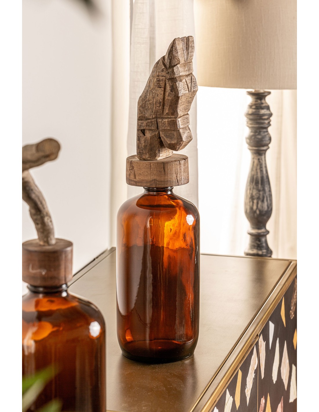 Esta botella recupera material histórico de antiguas industrias indias y lo transforma en un accesorio decorativo singular. El caballo de madera sobre el tapón añade un toque vintage, haciendo que cada pieza sea interesante, exclusiva y con alma.
