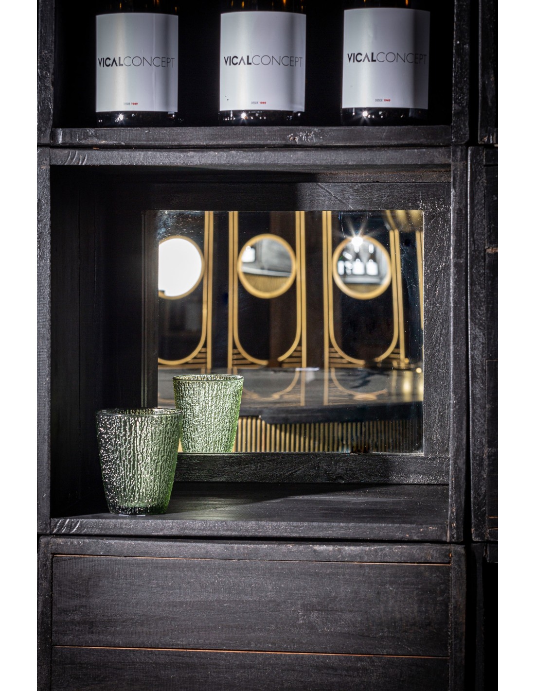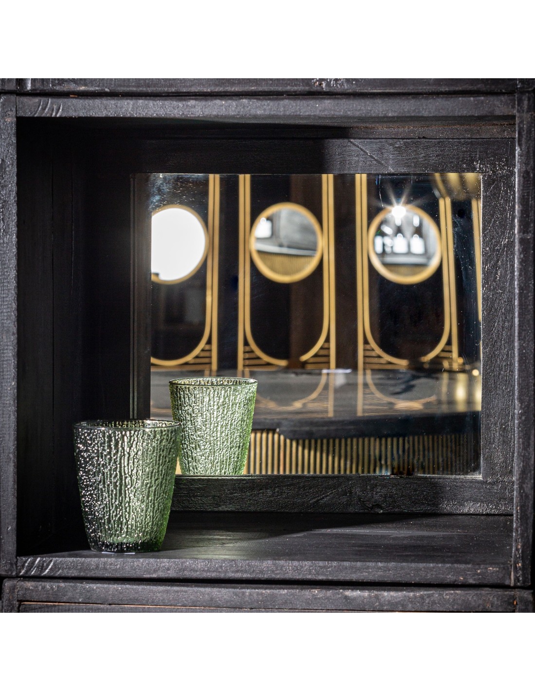 ESTANTE MODULAR GWIN, EN COLOR NEGRO TEÑIDO, DE ESTILO CONTEMPORÁNEO. FABRICADO EN MADERA MAHOGANI, COMBINADO CON MADERA DE ACACIA Y MADERA DE PINO. CON ESPEJO. COMPATIBLE CON: 26663, 29162.