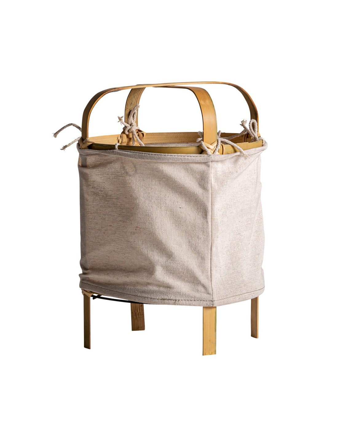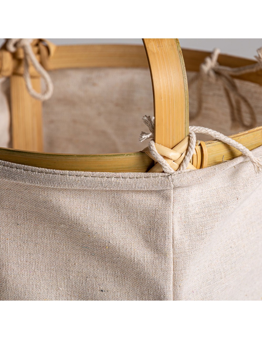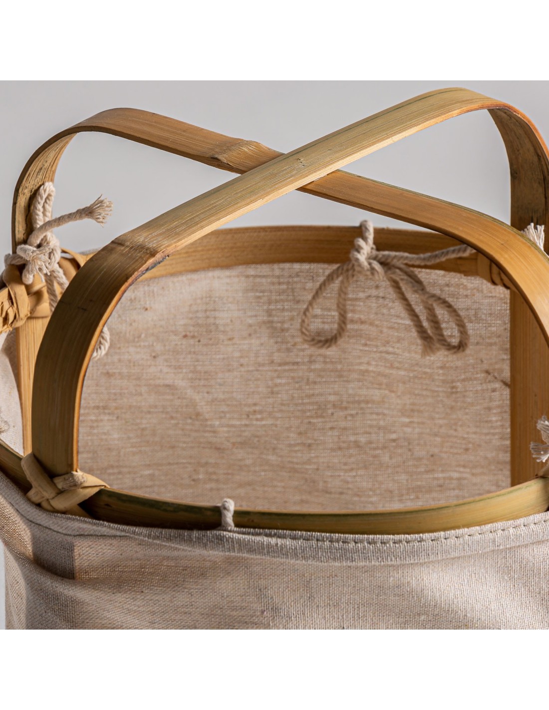 LÁMPARA DE SOBREMESA, EN COLOR MARRÓN, DE ESTILO CONTEMPORÁNEO. FABRICADO EN BAMBÚ, COMBINADO CON LINO Y HIERRO.