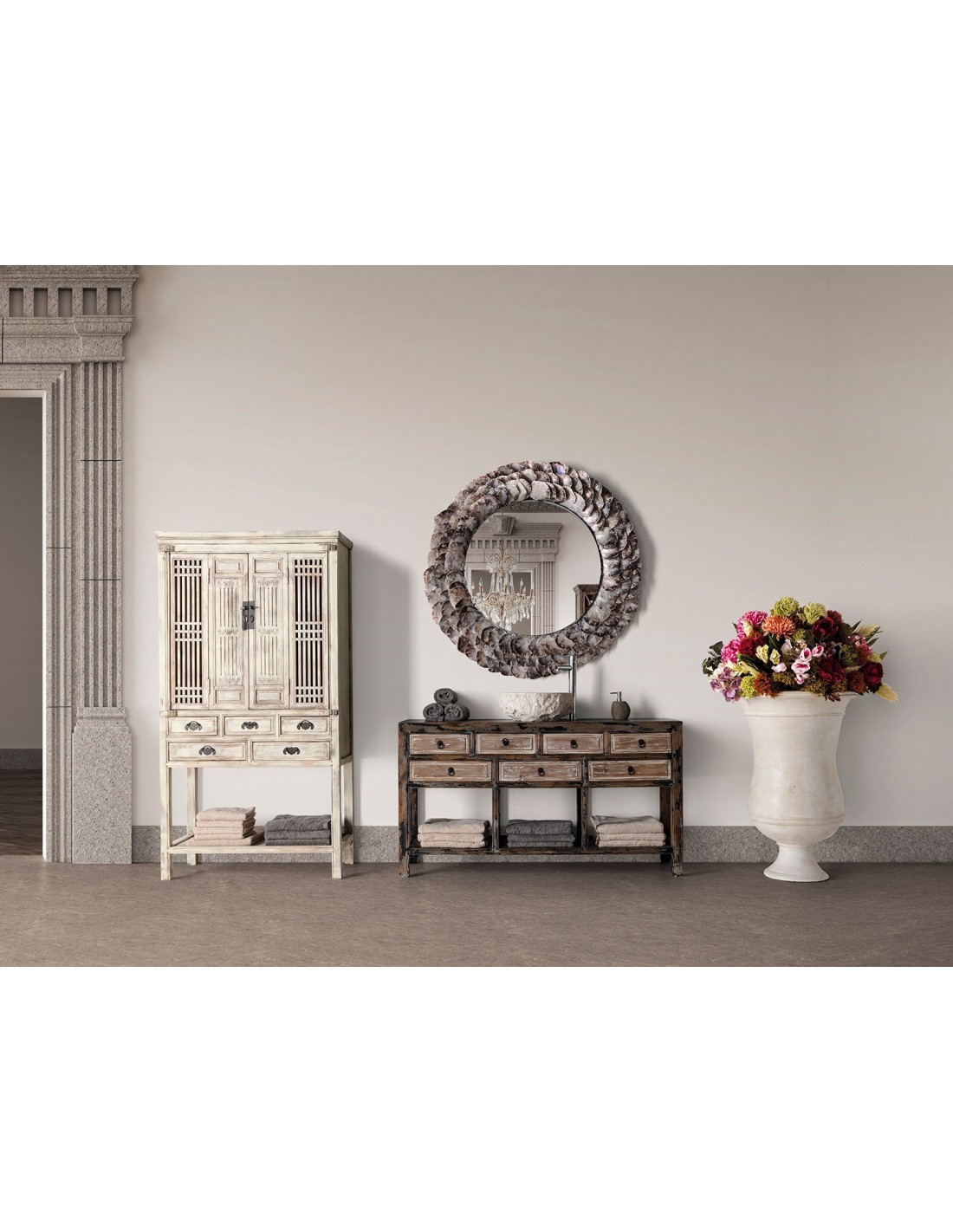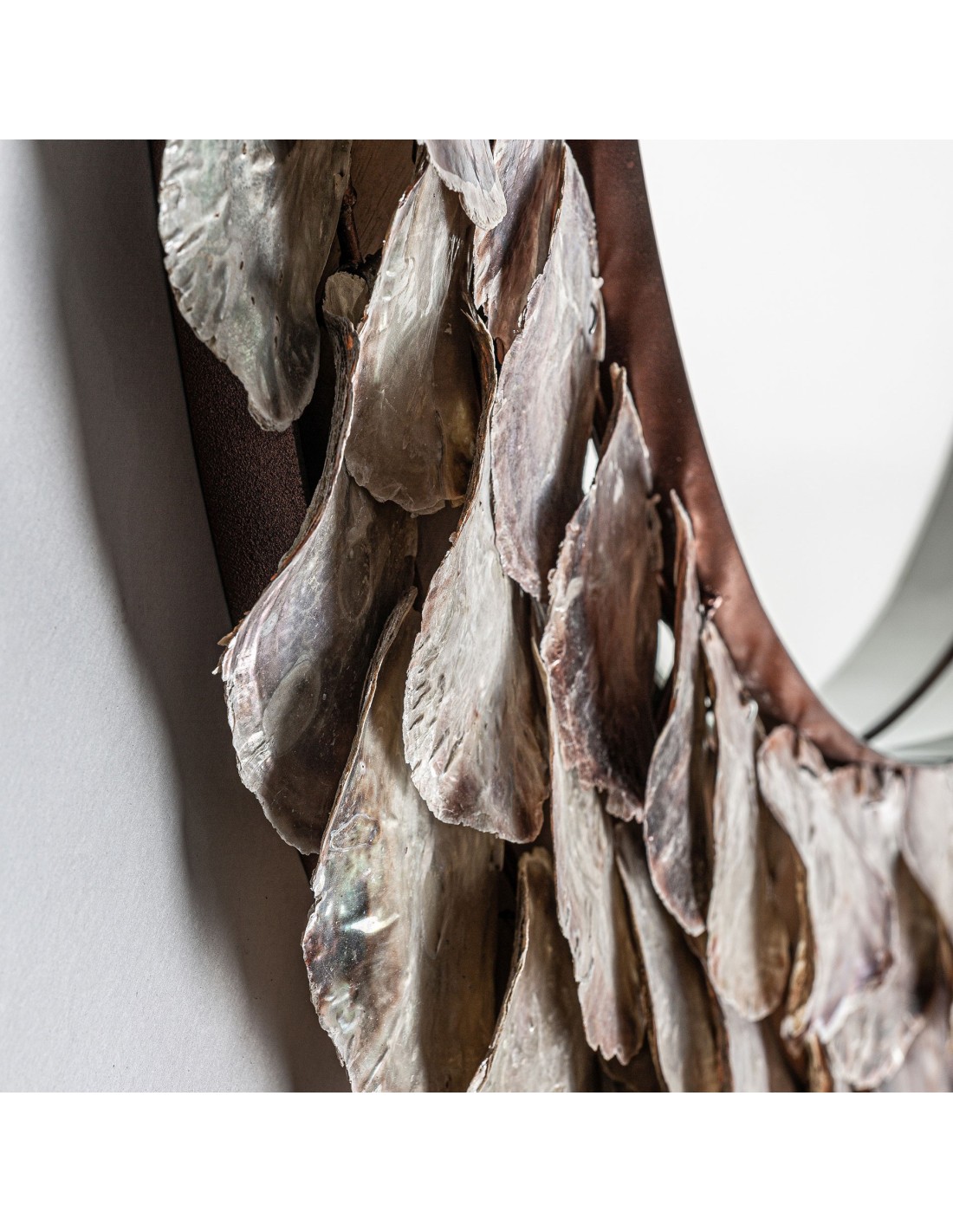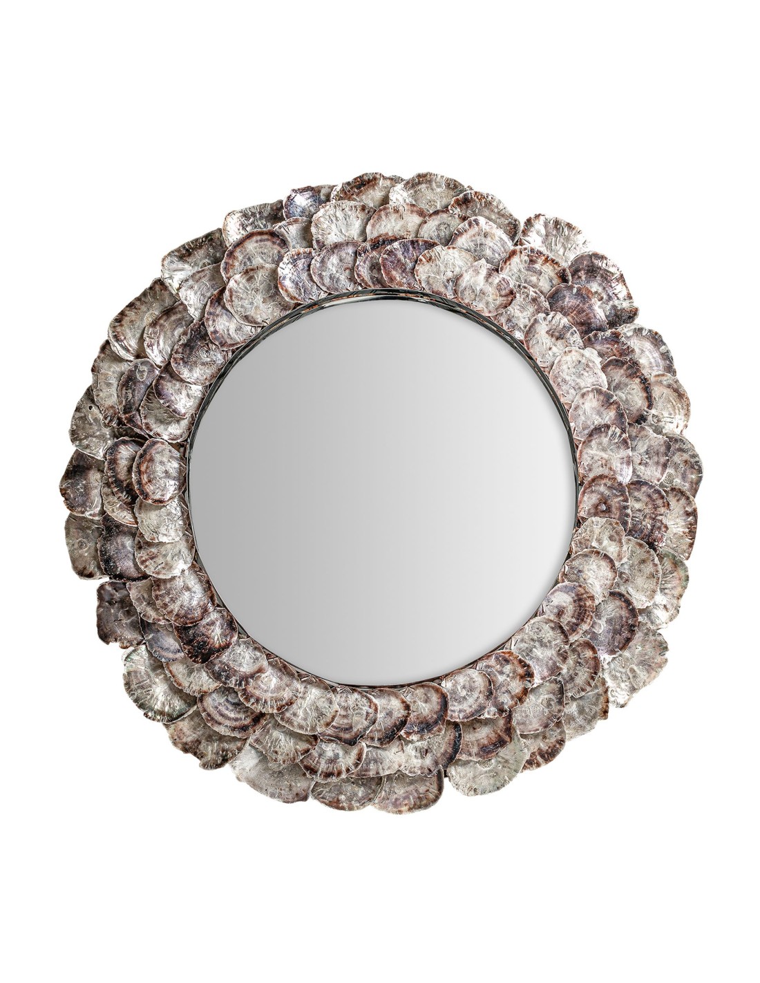 ESPEJO REDONDO INGA, EN COLOR MARFIL, DE ESTILO NÓRDICO. FABRICADO EN ACERO, COMBINADO CON CONCHA Y ESPEJO.