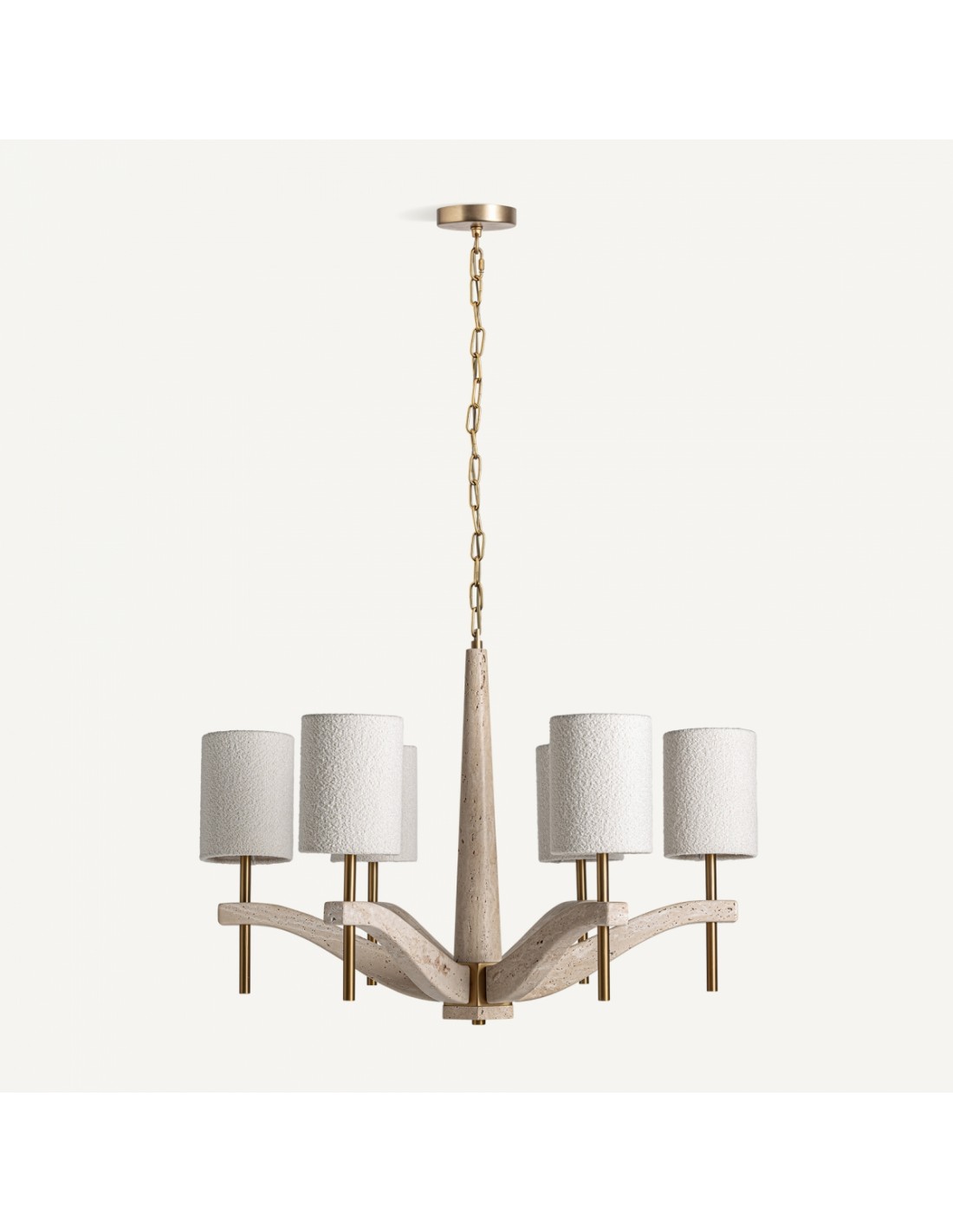 El mármol beige natural aporta sofisticación y un carácter exclusivo a la pieza, mientras que la estructura metálica dorada introduce un toque elegante y moderno. Esta combinación de materiales nobles crea una lámpara que transmite lujo discreto y equilibrio estético.