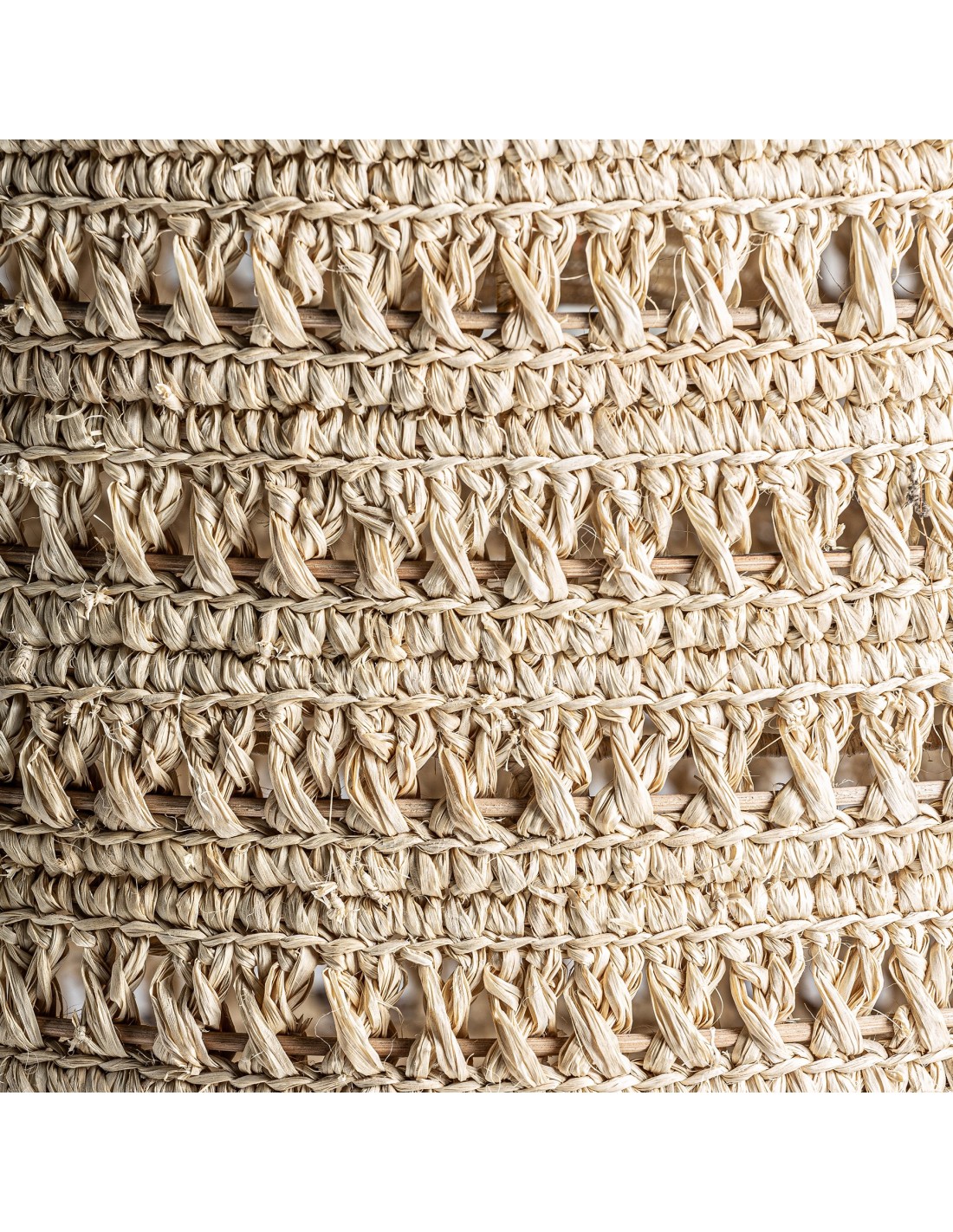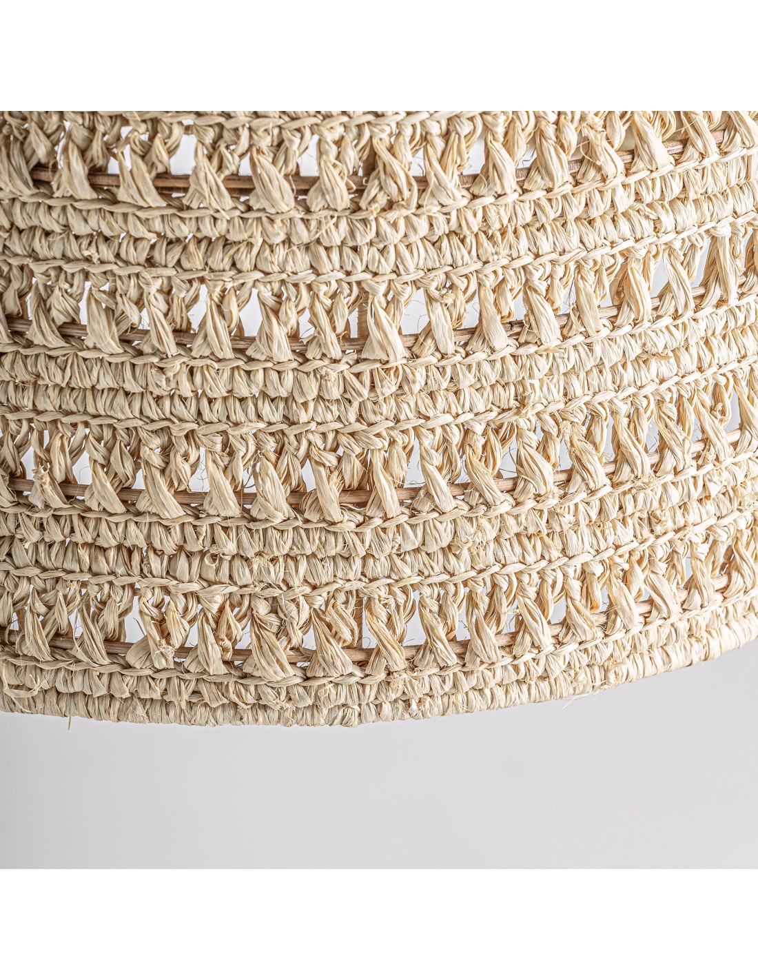 Su estructura de fibra natural en tono crema permite que la luz se filtre de forma suave, creando una iluminación cálida y envolvente perfecta para interiores con decoración natural o mediterránea.