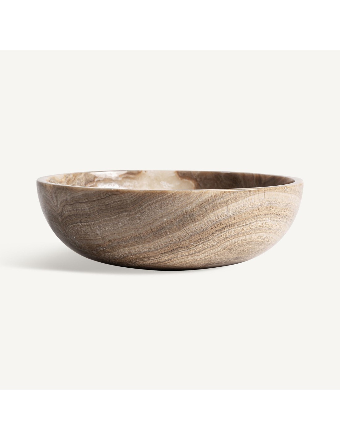 Fabricado con ónix natural, cada pieza es única, con vetas y tonalidades que reflejan la autenticidad del material. Sus dimensiones compactas (20 x 20 x 7 cm) permiten integrarlo fácilmente en todo tipo de composiciones decorativas.