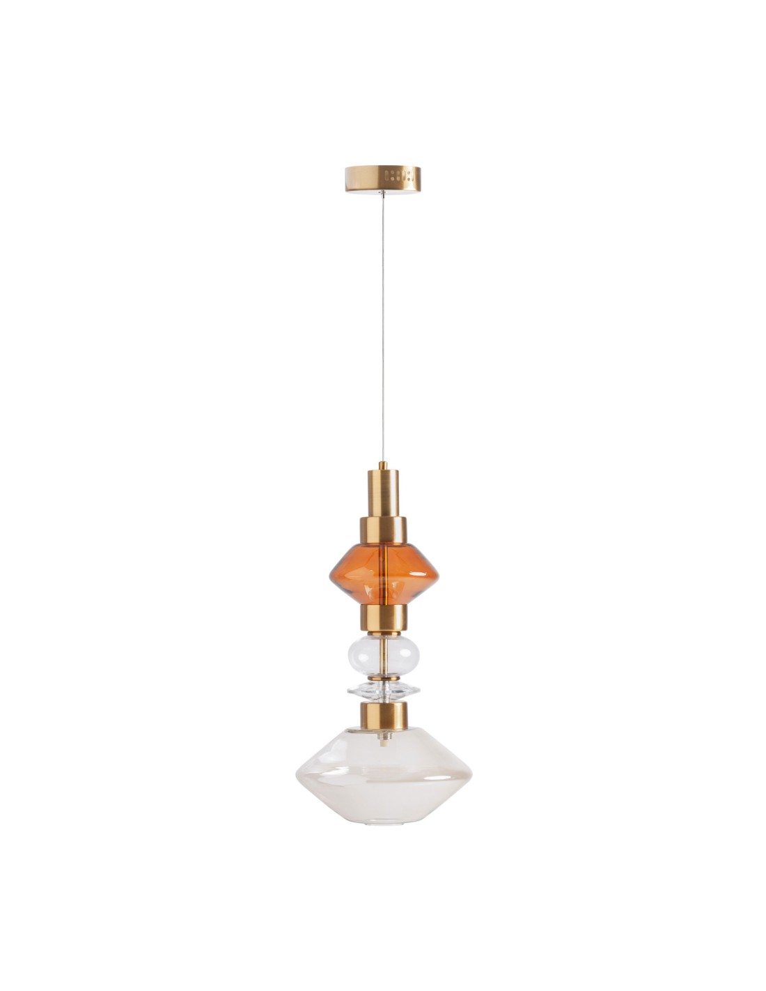 Lámpara de colgar de diseño elegante y moderno, fabricada en cristal con acabado ahumado en tonos neutros y estructura metálica en color cobre. Ideal para aportar estilo y calidez a cualquier estancia.