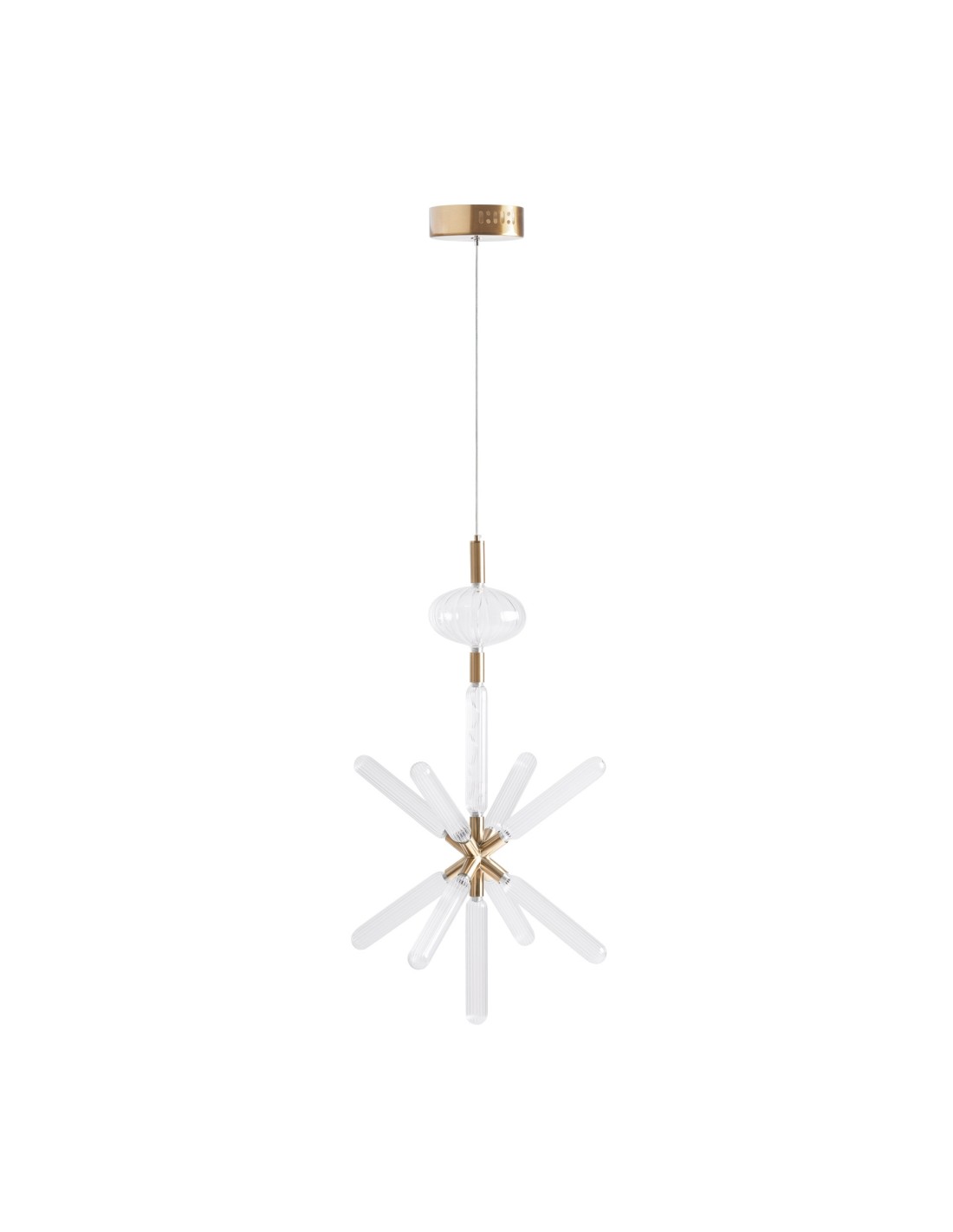 La lámpara de colgar de Vical Home destaca por su diseño minimalista y sofisticado, que combina la pureza del cristal transparente con la calidez del acero acabado en bronce. Esta pieza es perfecta para iluminar con estilo salones, comedores, recibidores o cualquier espacio que requiera una luz envolvente y decorativa.