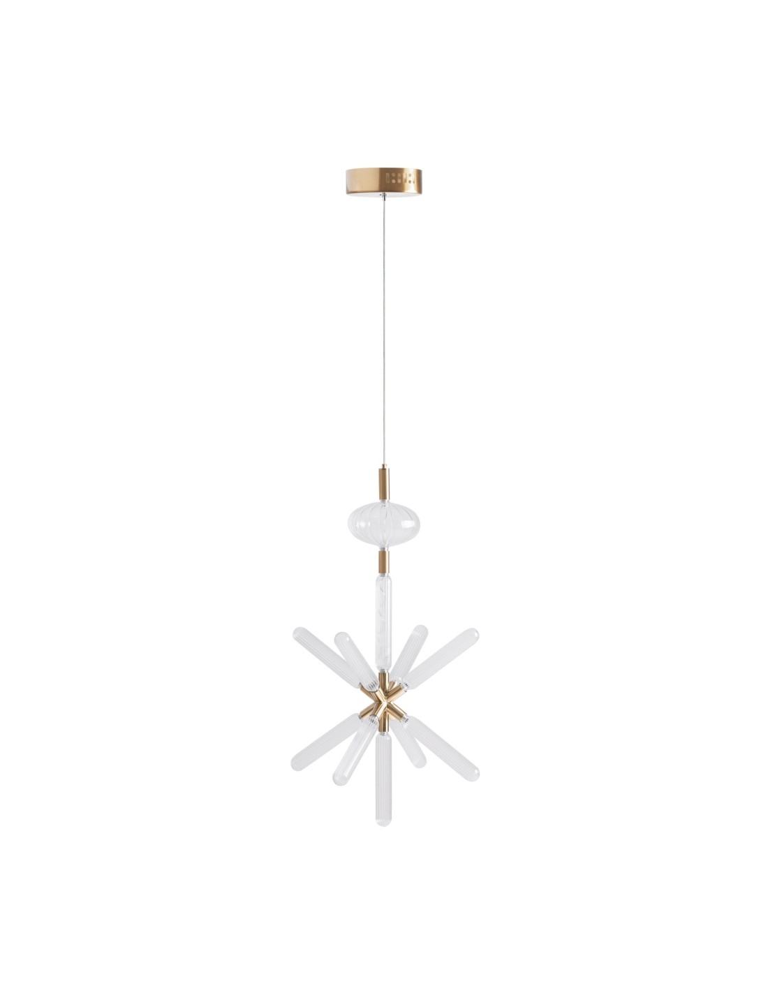 Lámpara colgante de diseño moderno y sofisticado, fabricada en cristal transparente con estructura de acero en color bronce. Ideal para iluminar y decorar espacios amplios con elegancia.