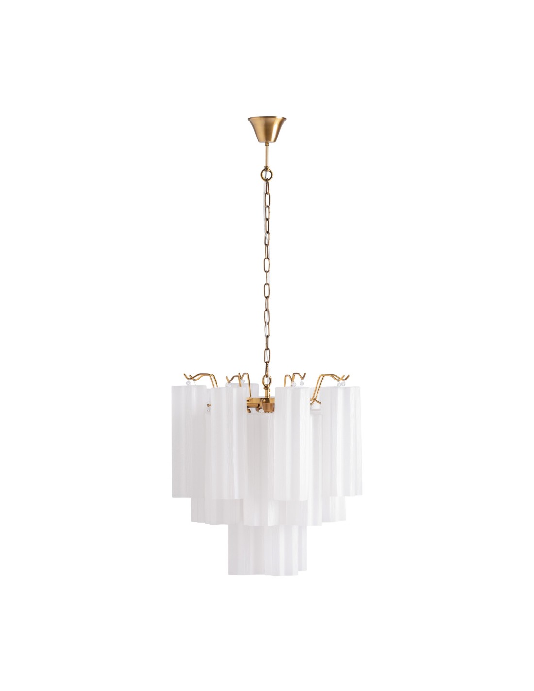 Lámpara colgante de diseño elegante y sofisticado, fabricada en cristal blanco combinada con estructura de acero en color dorado. Perfecta para iluminar y decorar espacios amplios con estilo y luminosidad.
