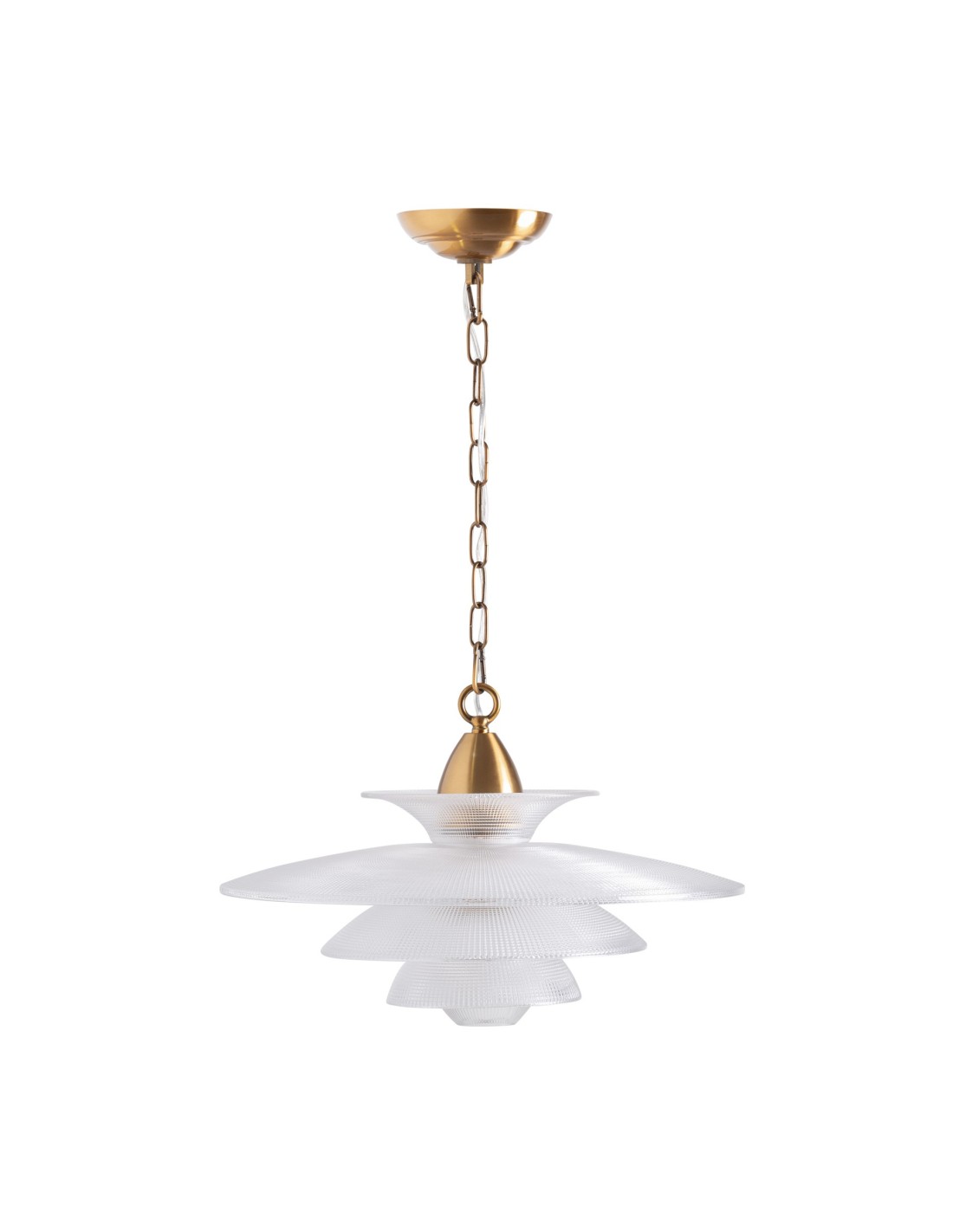 Lámpara colgante de diseño sofisticado, fabricada en cristal transparente y estructura en acero dorado. Una pieza decorativa elegante y atemporal de Vical Home, perfecta para dar luz y estilo a cualquier estancia.