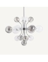 El cristal gris ahumado proporciona una luz cálida, envolvente y atenuada, perfecta para crear ambientes íntimos y acogedores. Su estructura metálica en acero con acabado oro viejo añade un aire noble, distinguido y ligeramente vintage, que encaja en estilos clásicos, art déco, contemporáneos o eclécticos.