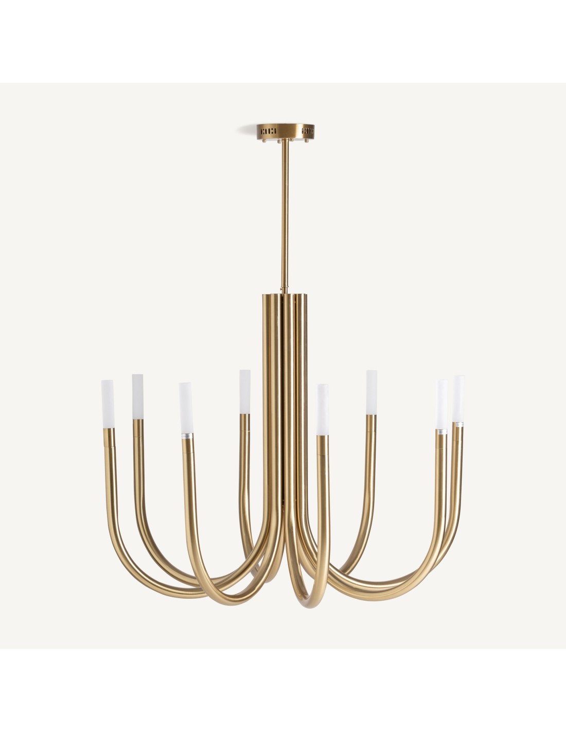 La lámpara de colgar Vical Home en cristal blanco y acero oro envejecido es la pieza perfecta para aportar luz y estilo en espacios amplios. Con unas dimensiones de 100 cm de ancho y fondo y una altura de 82 cm, esta lámpara se convierte en el foco principal de cualquier estancia, desde salones hasta comedores o entradas.
