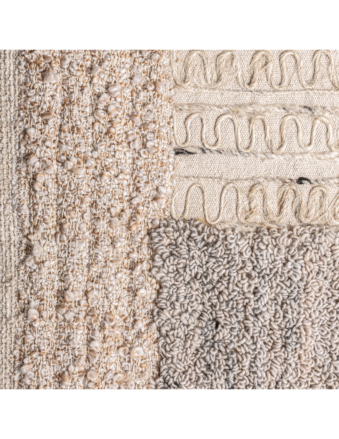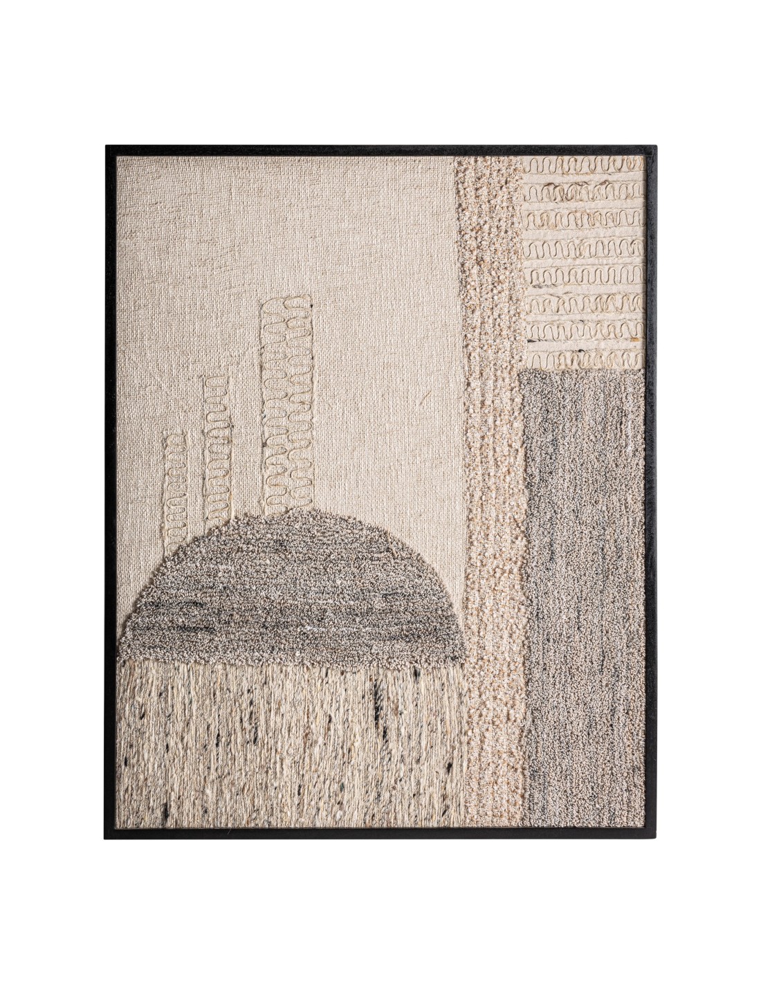 Cuadro decorativo de estilo contemporáneo, fabricado en yute y algodón en tonos neutros, con estructura de madera de mango en color negro. Una pieza artística, texturizada y elegante para ambientes modernos.