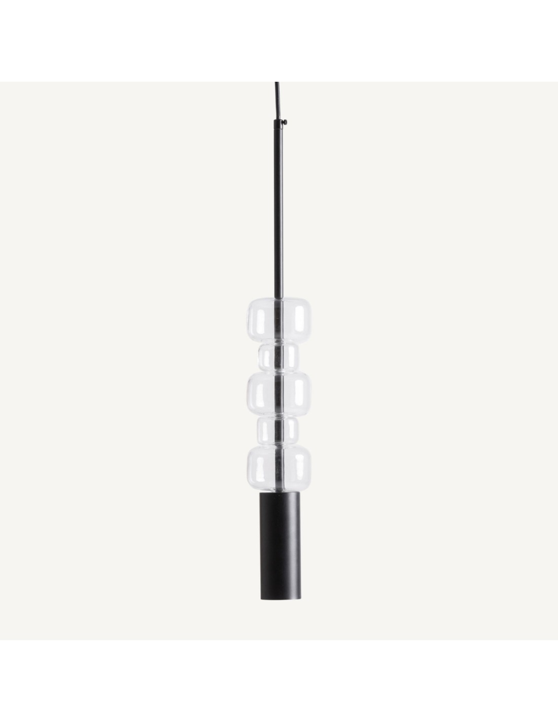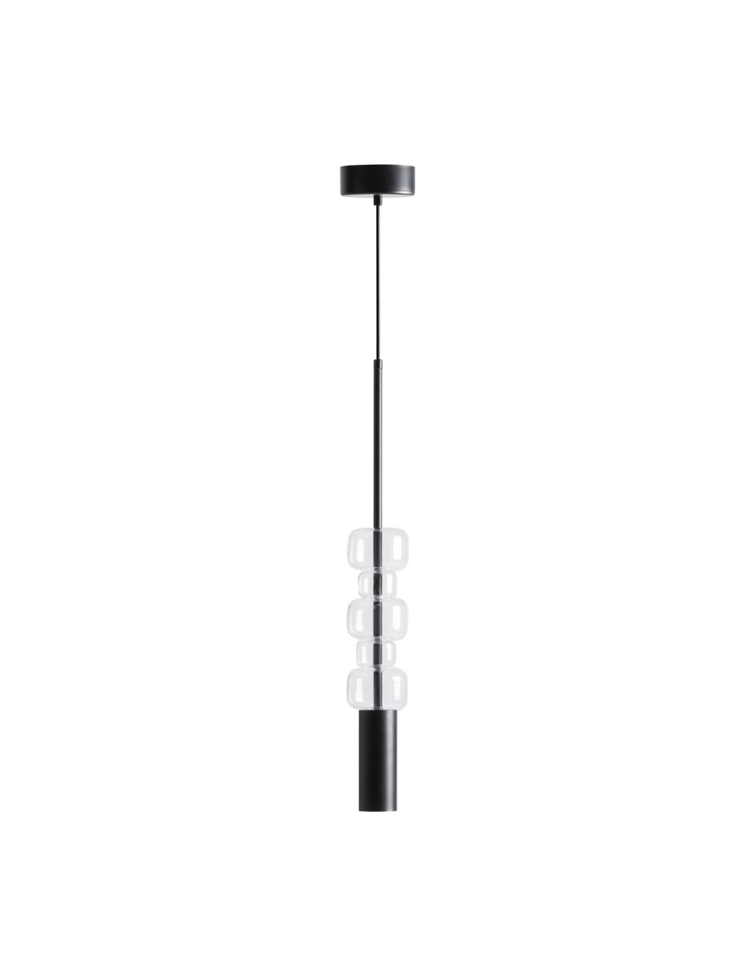 Lámpara colgante moderna y minimalista fabricada en cristal transparente con estructura de acero negro mate. Compacta y elegante, mide 9×9 cm de base y 60 cm de alto, perfecta para iluminar con estilo espacios pequeños o detalles decorativos.
