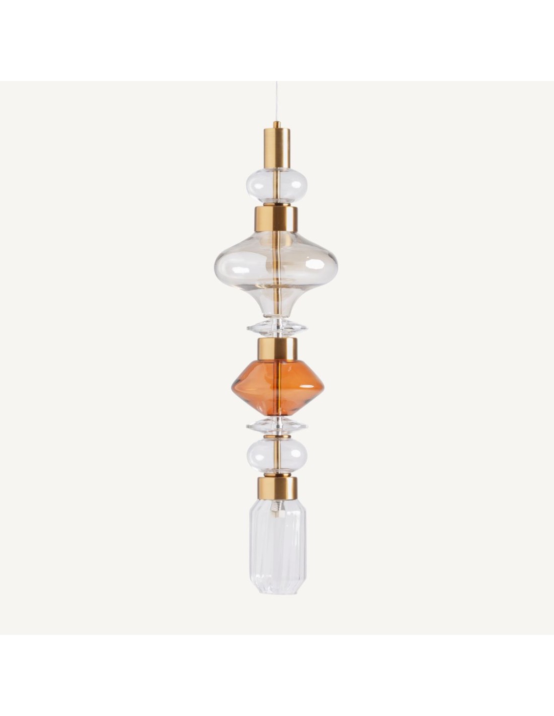 Esta lámpara colgante de Vical Home destaca por la delicada combinación de cristal en tonos neutros con acabado ahumado y estructura de acero en color cobre, que aporta calidez y un toque industrial elegante. Su diseño estilizado y alto (19x19x76 cm) es ideal para espacios que buscan una iluminación sofisticada y un punto focal visual.