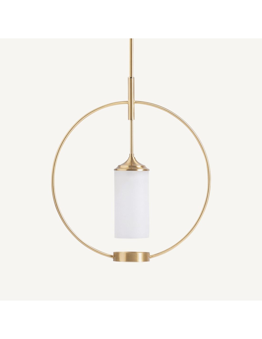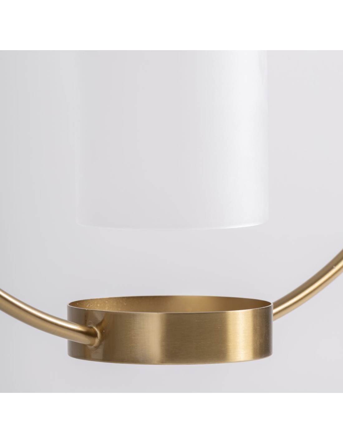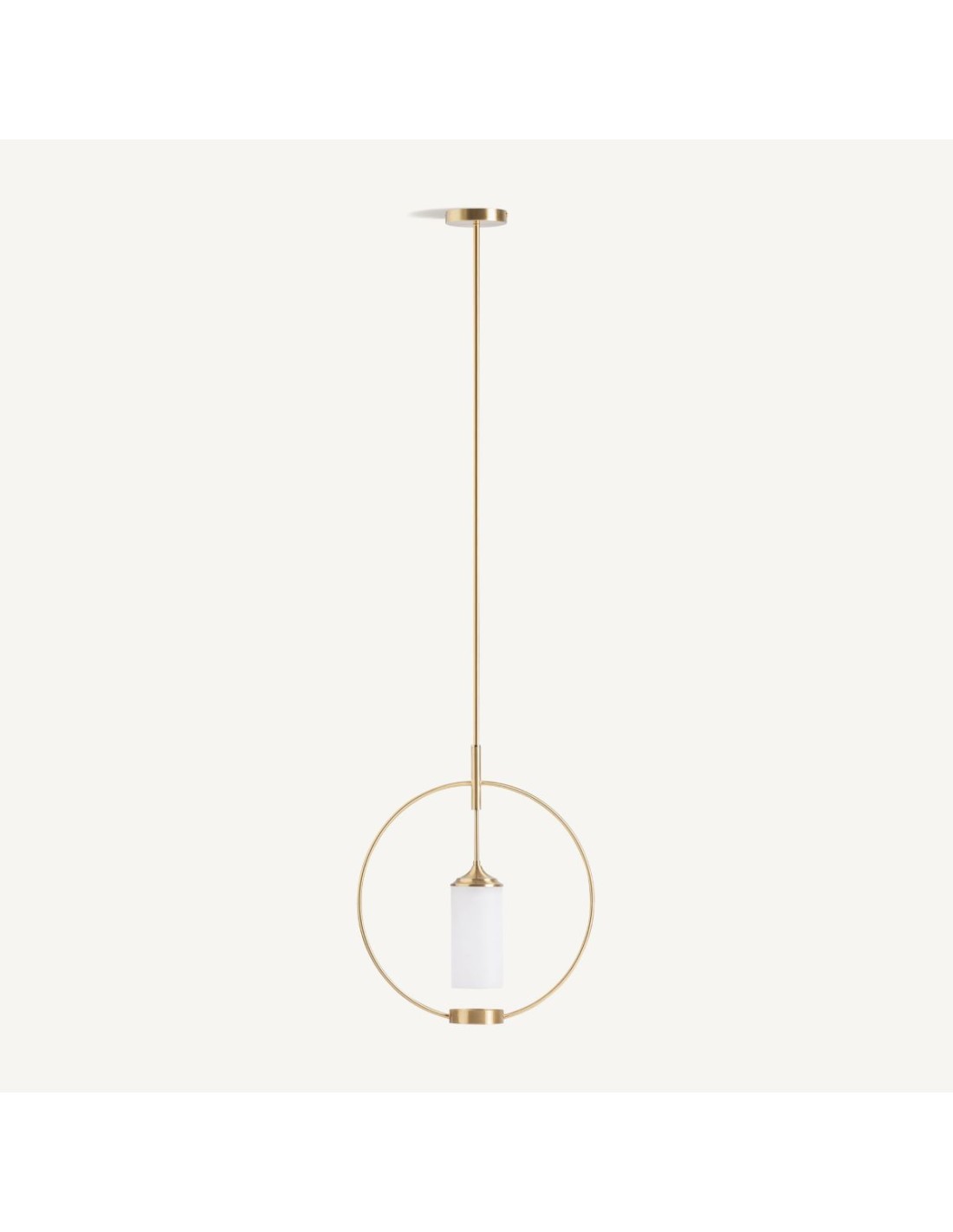 Esta lámpara colgante de Vical Home destaca por su diseño esbelto (156 cm de alto) y la combinación de materiales nobles: cristal en color marfil que aporta luminosidad suave y cálida, y acero con acabado oro viejo, que añade un aire vintage y sofisticado.