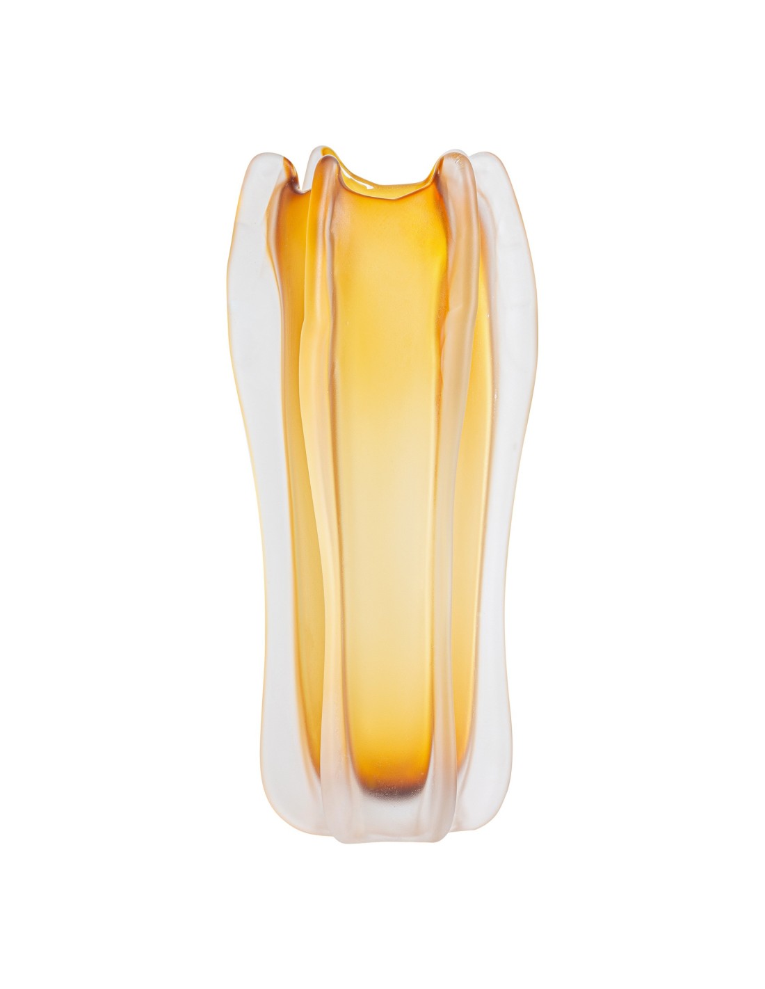 Su acabado pulido resalta la belleza natural del vidrio, haciendo que la luz atraviese suavemente la pieza y creando un ambiente acogedor y elegante. Ideal para colocar flores frescas o secas, o para lucirlo como pieza escultórica independiente en salones, dormitorios o recibidores modernos.