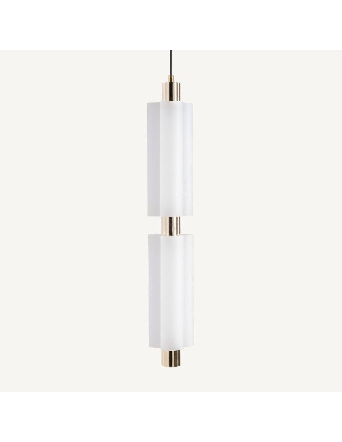 Elegante lámpara colgante fabricada en cristal blanco combinado con estructura de acero en acabado dorado. Perfecta para aportar sofisticación y luz cálida a cualquier espacio moderno.