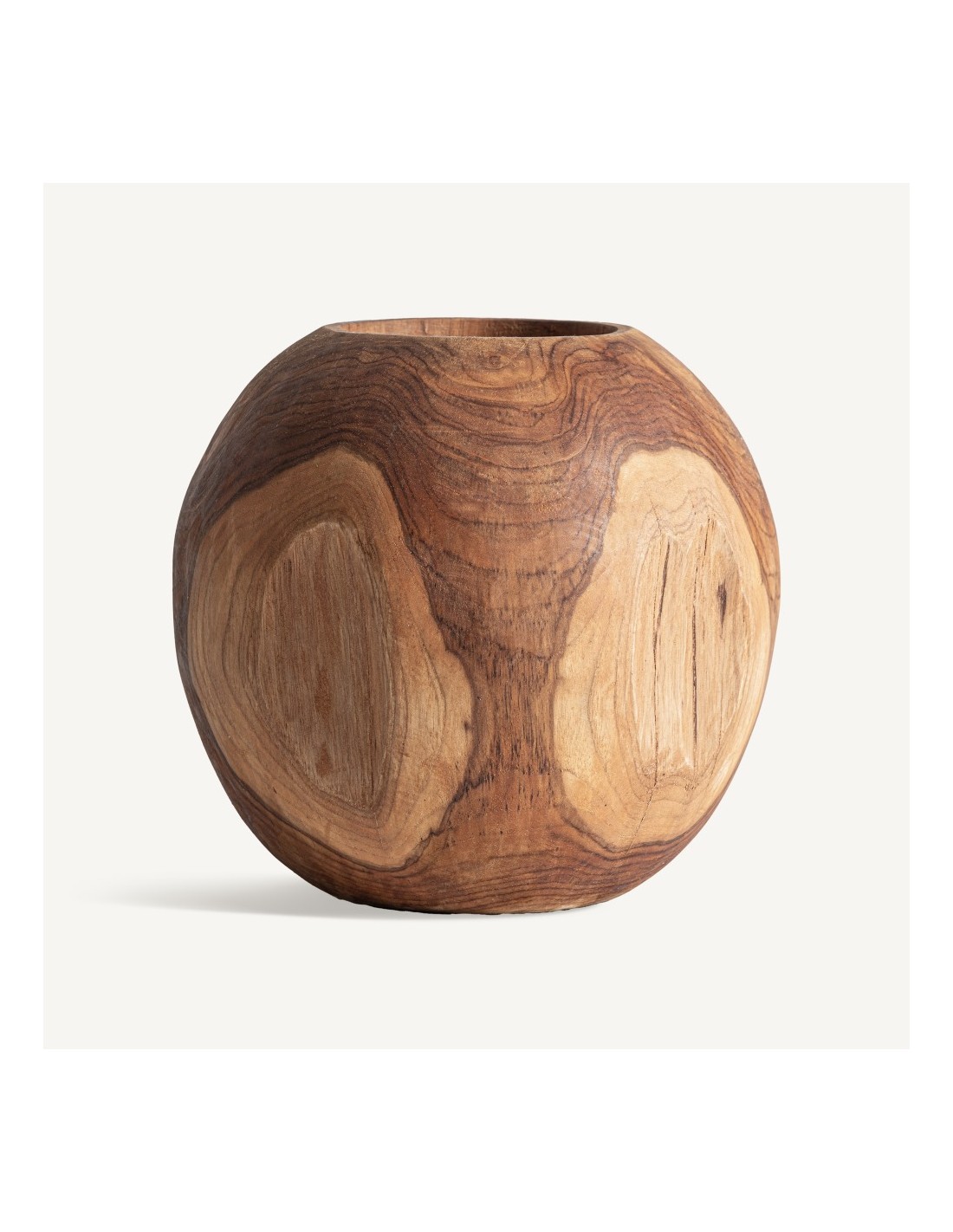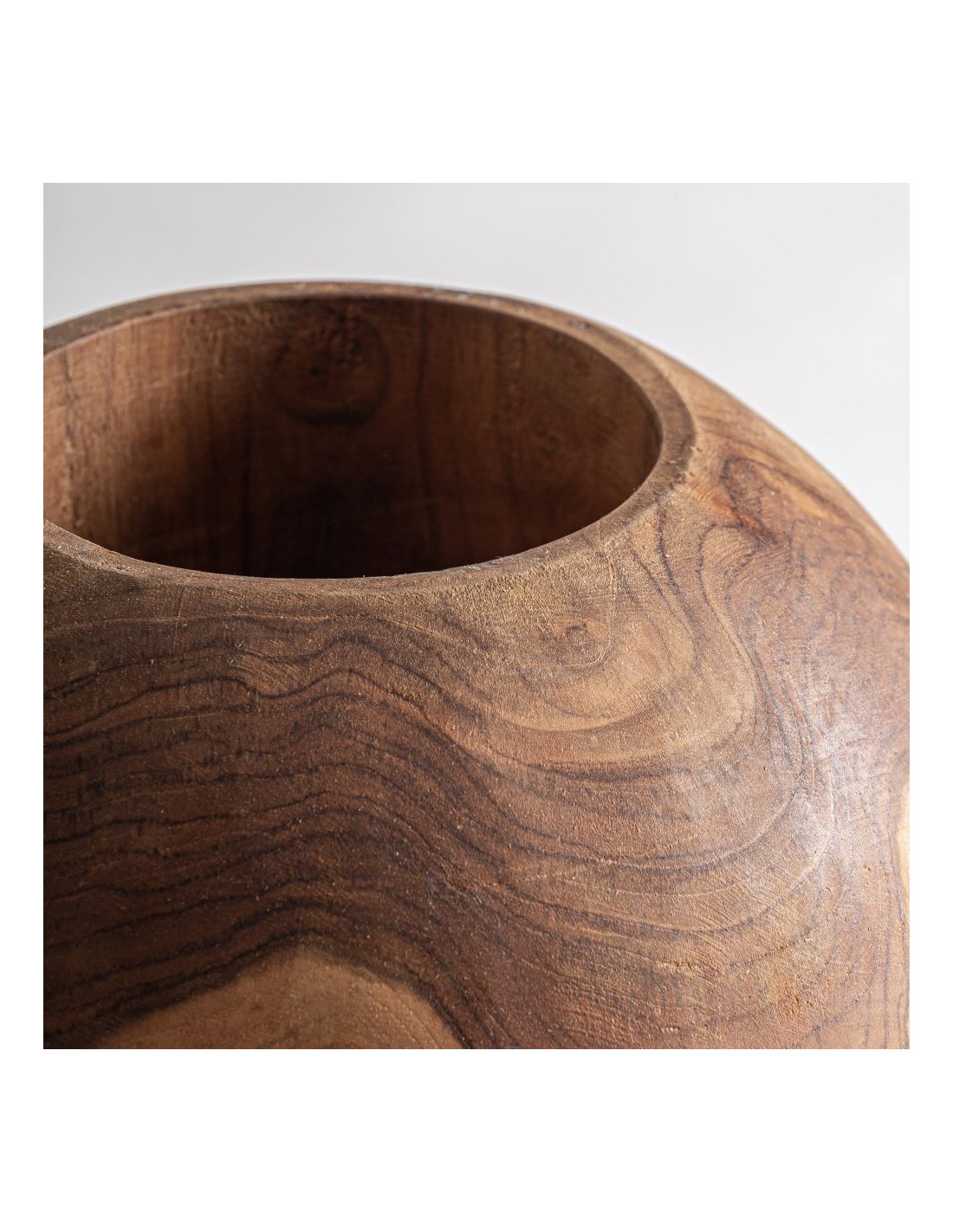 Cada pieza está cuidadosamente tallada, conservando las vetas y matices propios de la teka, lo que hace que ningún jarrón sea igual a otro. Su forma orgánica y textura natural lo convierten en un elemento decorativo ideal para exhibir flores secas, ramas naturales o simplemente como pieza escultórica independiente.