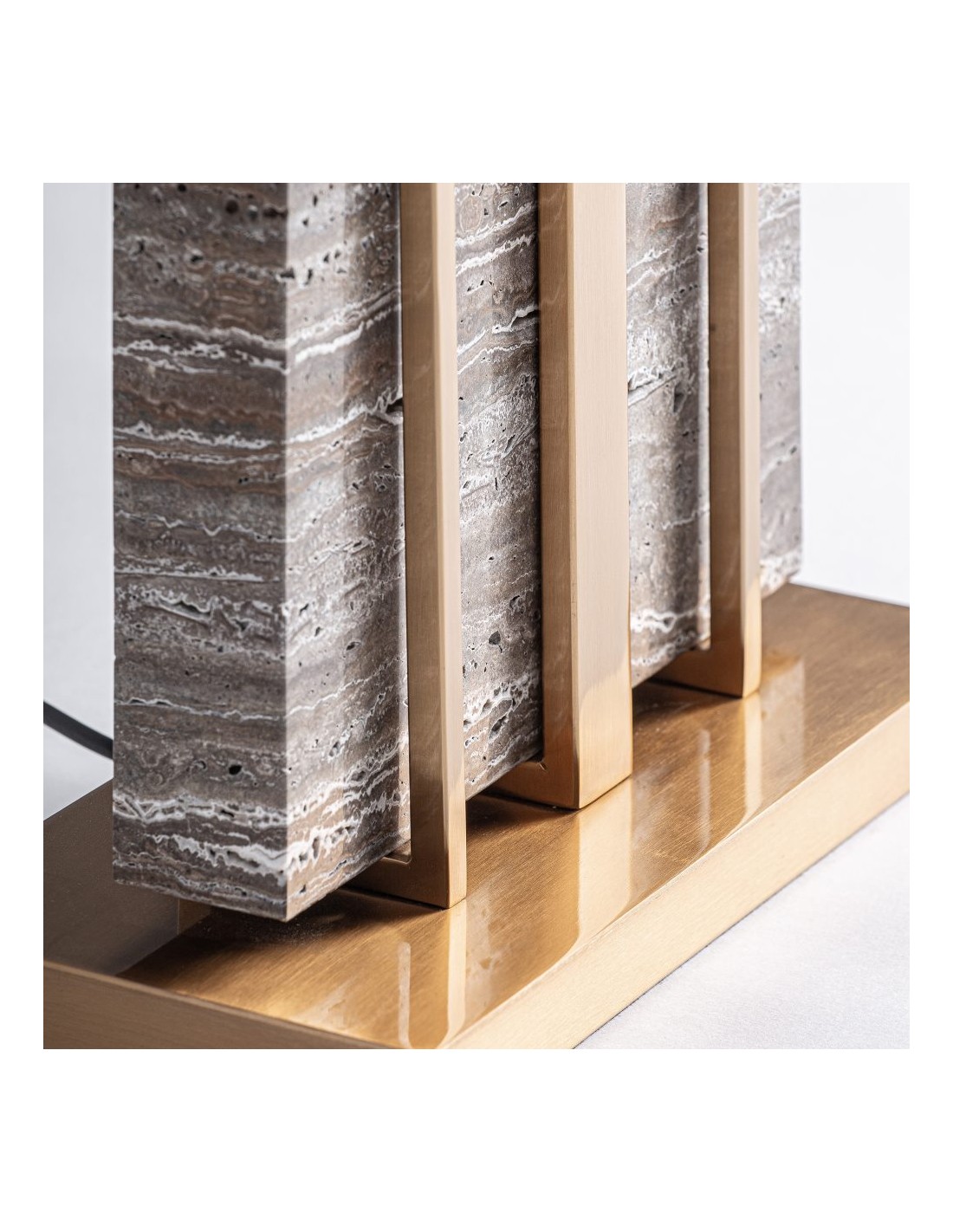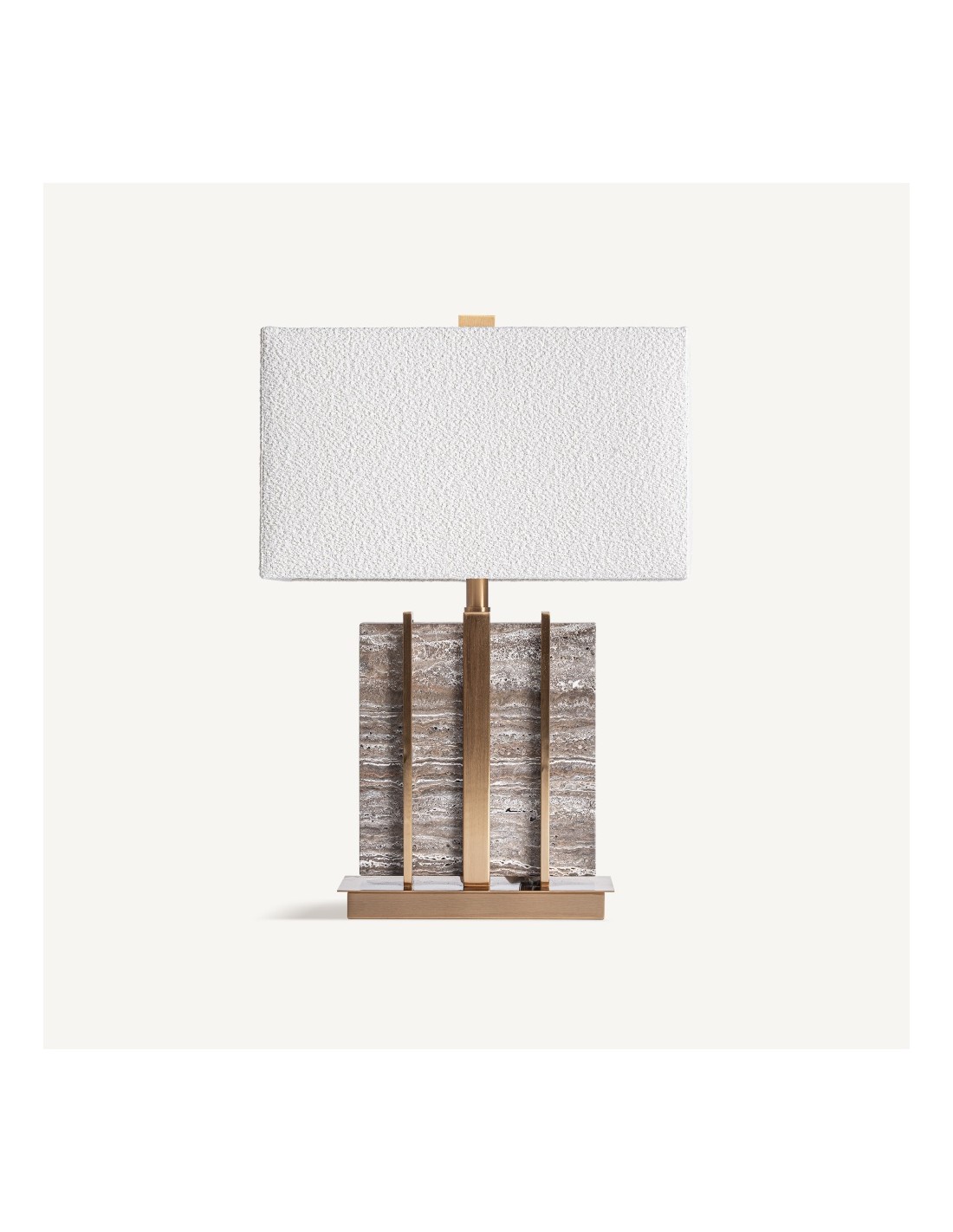 La Lámpara Gia destaca por su base de mármol gris, que aporta estabilidad y presencia, combinada con detalles dorados en hierro y pantalla de poliéster crema para una iluminación suave y elegante. Su diseño desmontable facilita su transporte y adaptación a diferentes espacios.